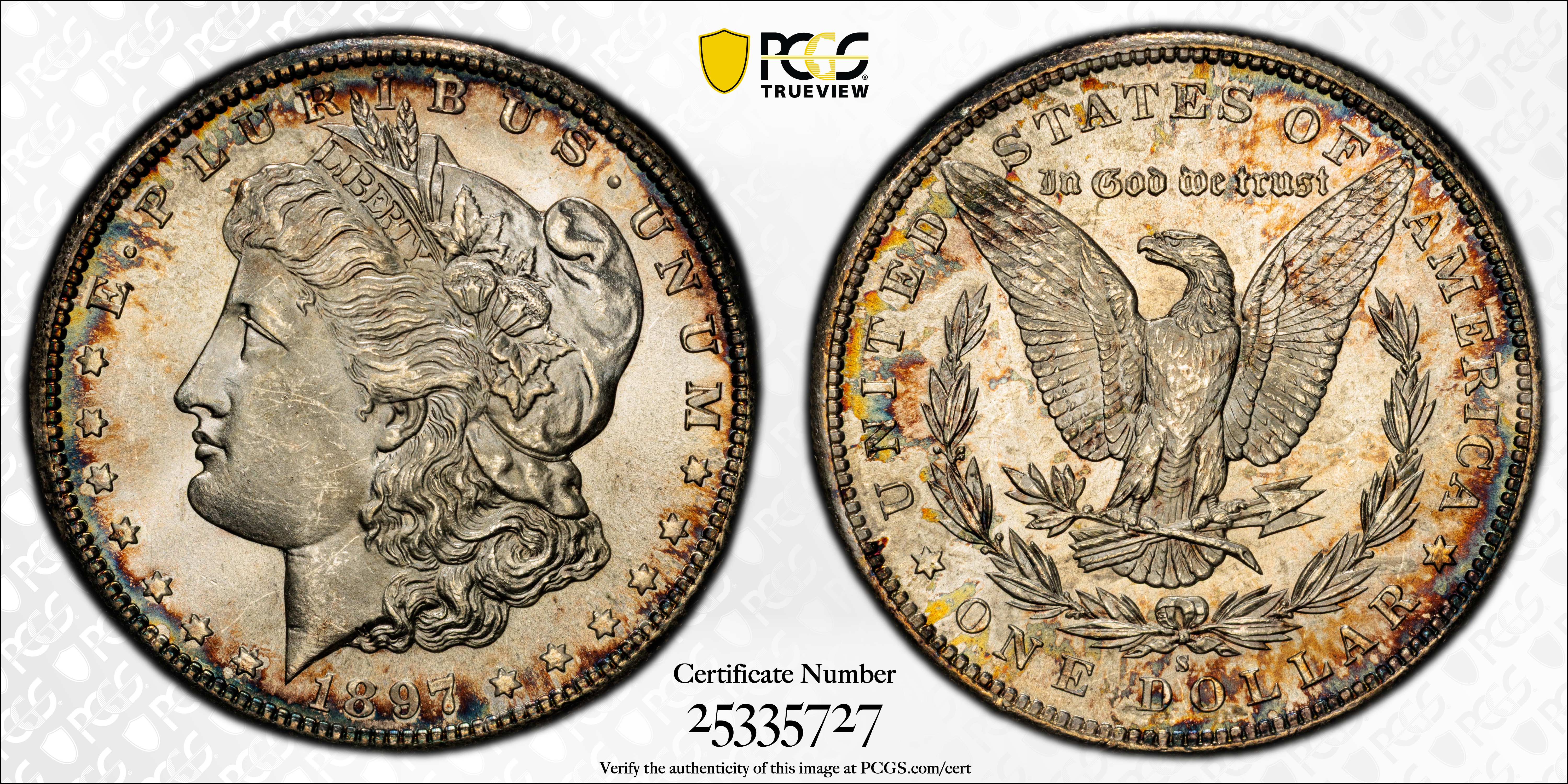 1897-S $1 MS66+ Certification #25335727, PCGS #7250