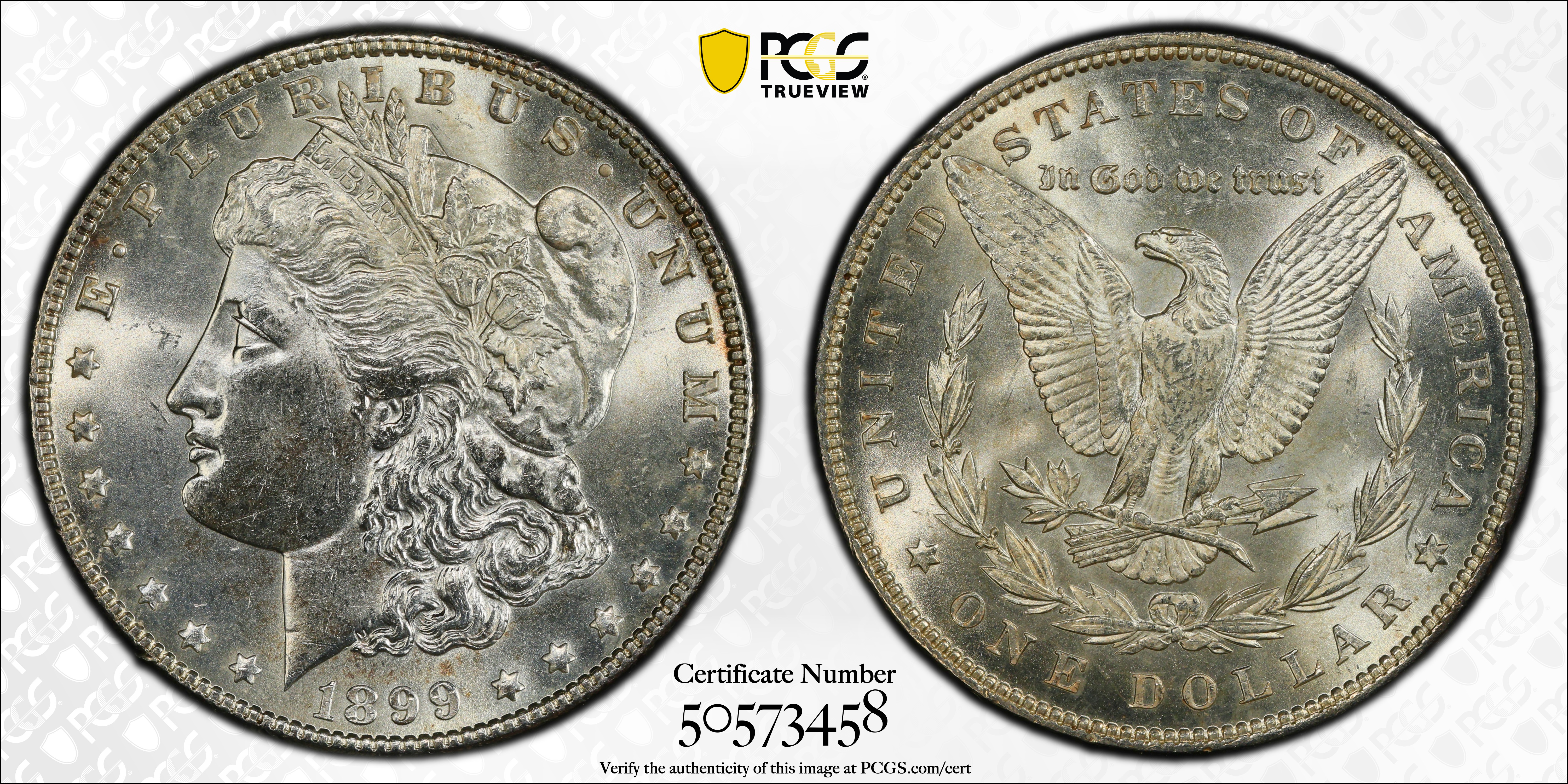Mint State grades: In Mint State the 1899 dollar is readily available. Most of the known pieces are in lower ranges. I estimate that 50,000 to 100,000 remain from MS-60 through 62; 25,000 to 50,000 at the next step, MS-63; 7,000 to 14,000 at the MS-64 stage; and only 2,500 to 5,000 MS-65 or better.