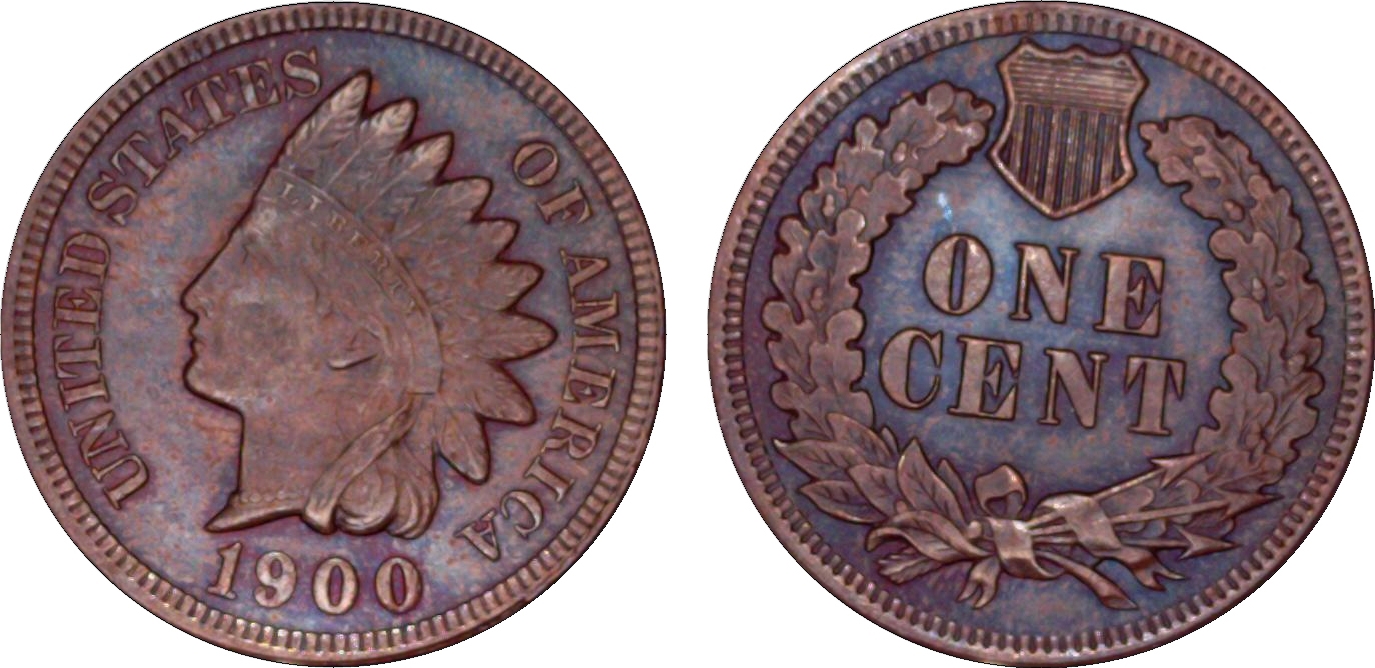 The 1900 Indian Cent has the highest mintage from the years 1859 to 1900. Therefore, the 1900 Indian Cent is very common in circulated grades. In Mint State condition it becomes scarce at about MS64 condition. However, there are probably still thousands of examples grading MS64 condition or higher. In MS65 they are much scarcer with possibly several hundred examples known. In MS66 condition or higher they are very hard to find with possibly no more than about 150 examples surviving. In MS67 condition it is almost rare with a few dozen examples verified. Anything grading higher is rare if any even exist.
