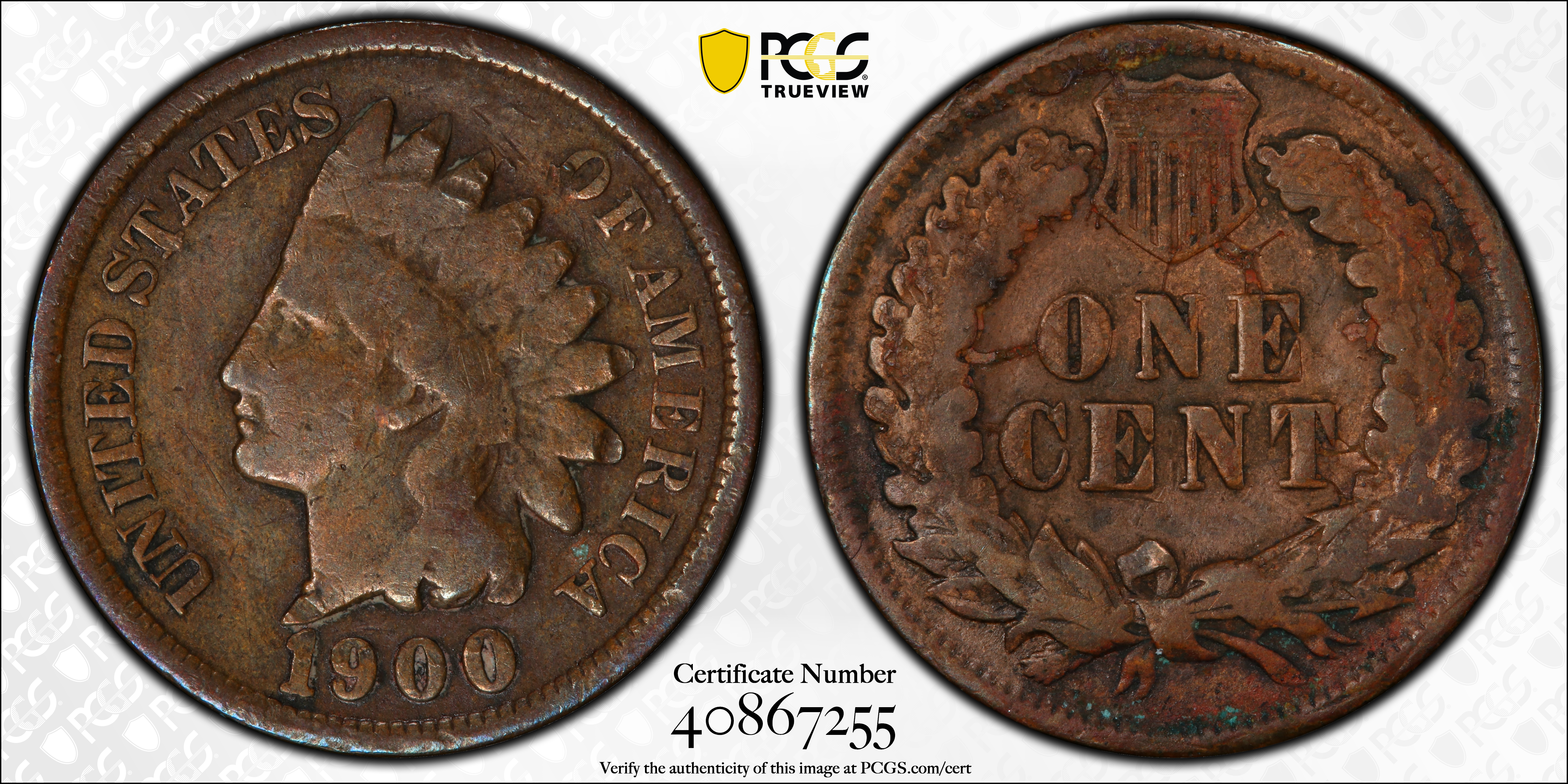 The 1900 Indian Cent has the highest mintage from the years 1859 to 1900. Therefore, the 1900 Indian Cent is very common in circulated grades. In Mint State condition it becomes scarce at about MS64 condition. However, there are probably still thousands of examples grading MS64 condition or higher. In MS65 they are much scarcer with possibly several hundred examples known. In MS66 condition or higher they are very hard to find with possibly no more than about 150 examples surviving. In MS67 condition it is almost rare with a few dozen examples verified. Anything grading higher is rare if any even exist.