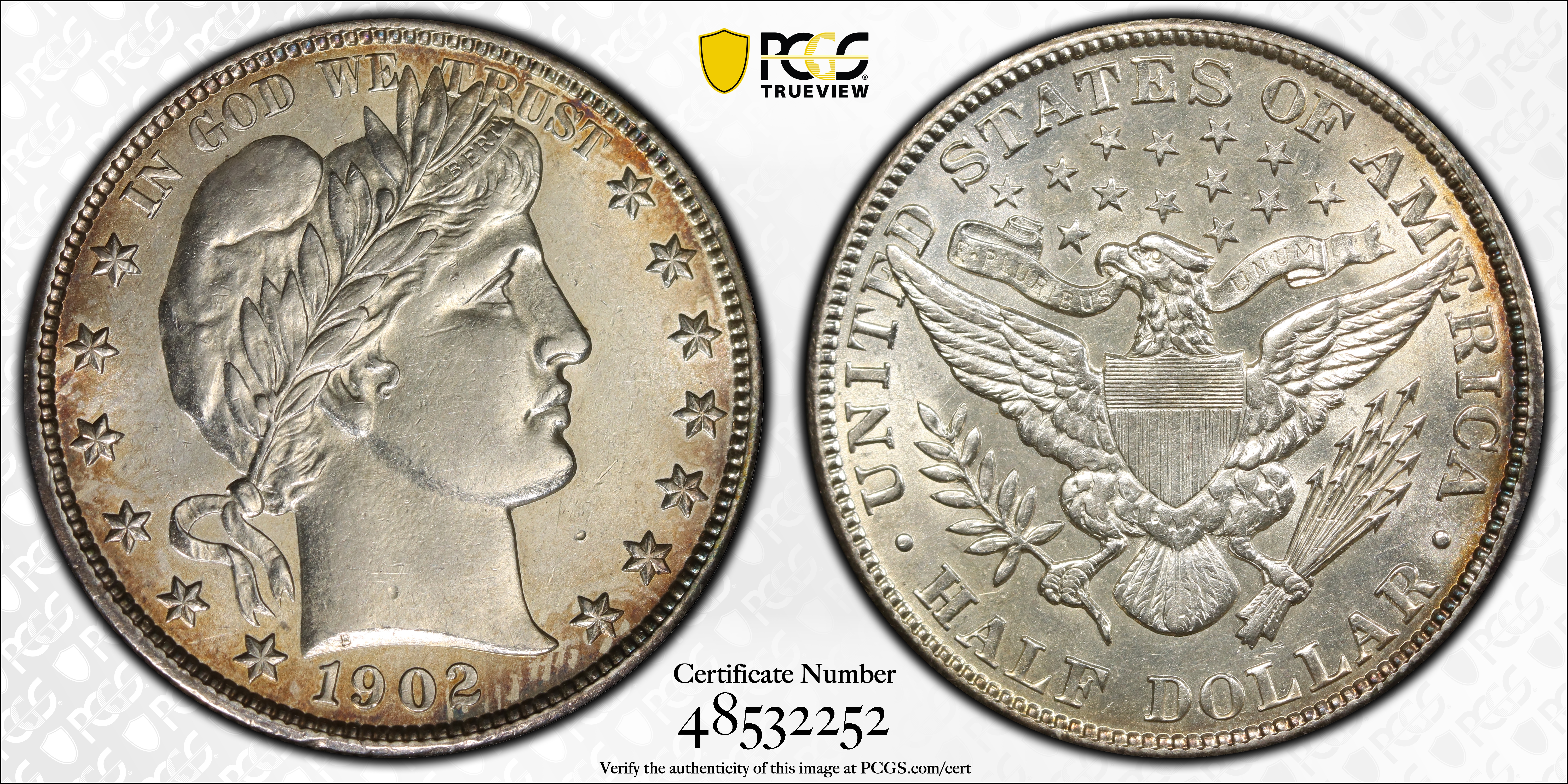The 1902 has one of the highest mintage figures in the entire series, just short of 5,000,000 pieces, yet for some reason it is extremely difficult to locate in Gem condition. To be sure, lower grade mint state pieces can be located with a little diligence, but true Gems...are almost non-existent. One would have better luck finding some of the more highly regarded mintmarked issues of the 1890's in Gem condition than one would have of locating a comparable quality 1902 Barber Half Dollar.PCGS #