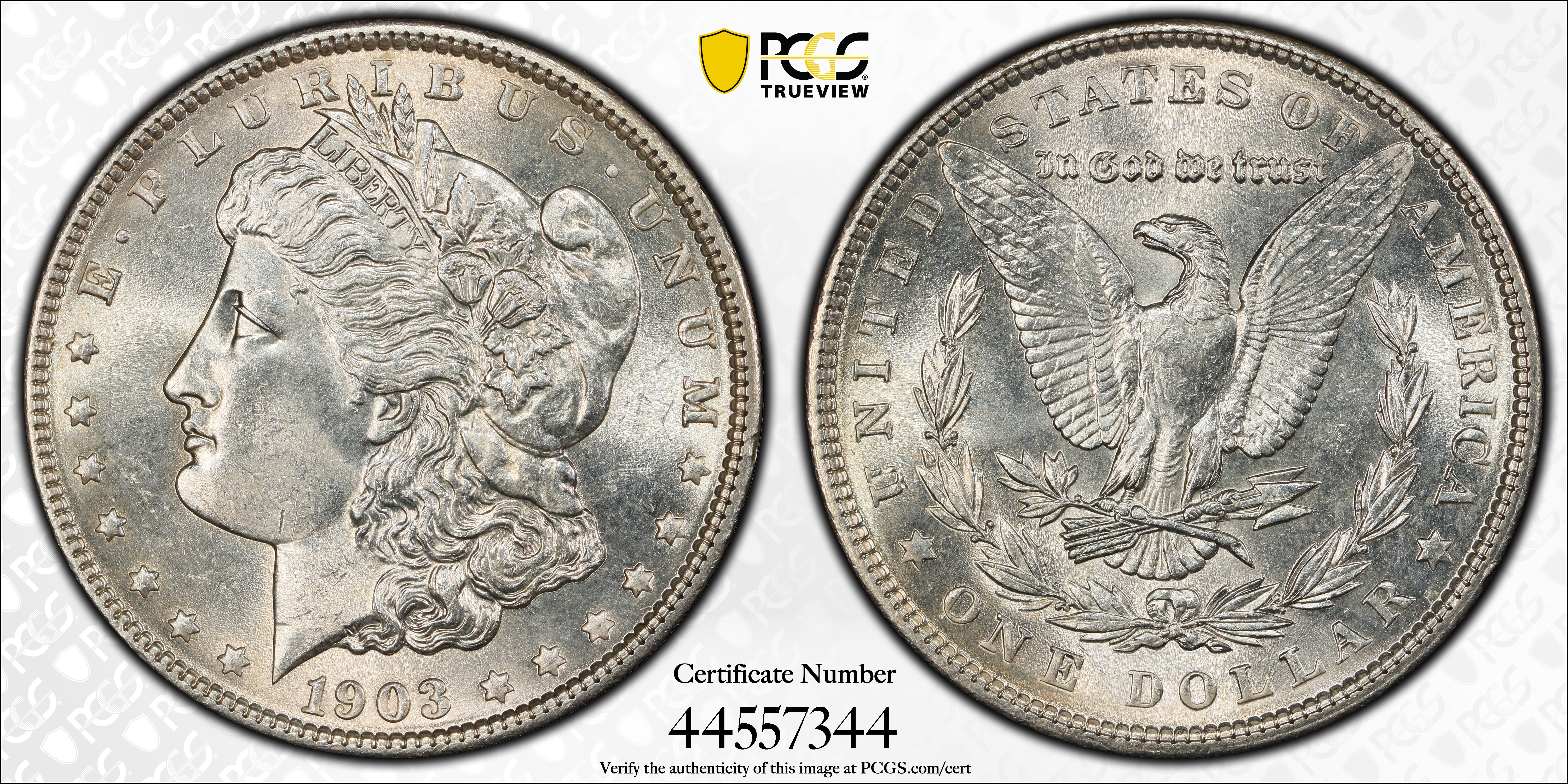 The 1903 Morgan Dollar is a very common coin thanks to numerous bags that have appeared on the market over the years. PCGS alone has certified over 13,000 examples of this date, with most falling into the MS64 to MS65 grade range. Superb examples are very scarce, but can be found occasionally in auction sales and in dealers' inventories. MS67 appears to be the last accessible grade.