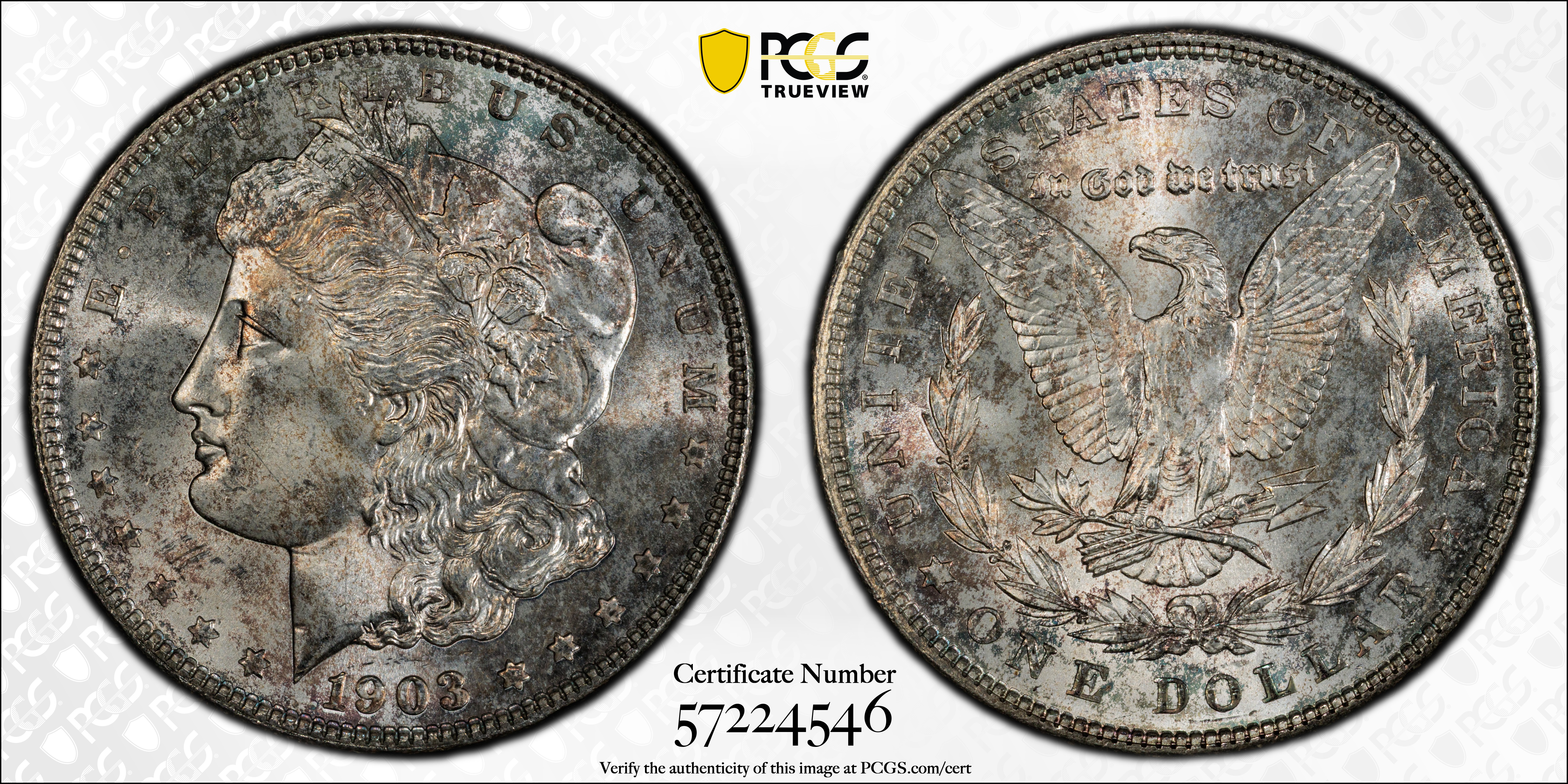 The 1903 Morgan Dollar is a very common coin thanks to numerous bags that have appeared on the market over the years. PCGS alone has certified over 13,000 examples of this date, with most falling into the MS64 to MS65 grade range. Superb examples are very scarce, but can be found occasionally in auction sales and in dealers' inventories. MS67 appears to be the last accessible grade.