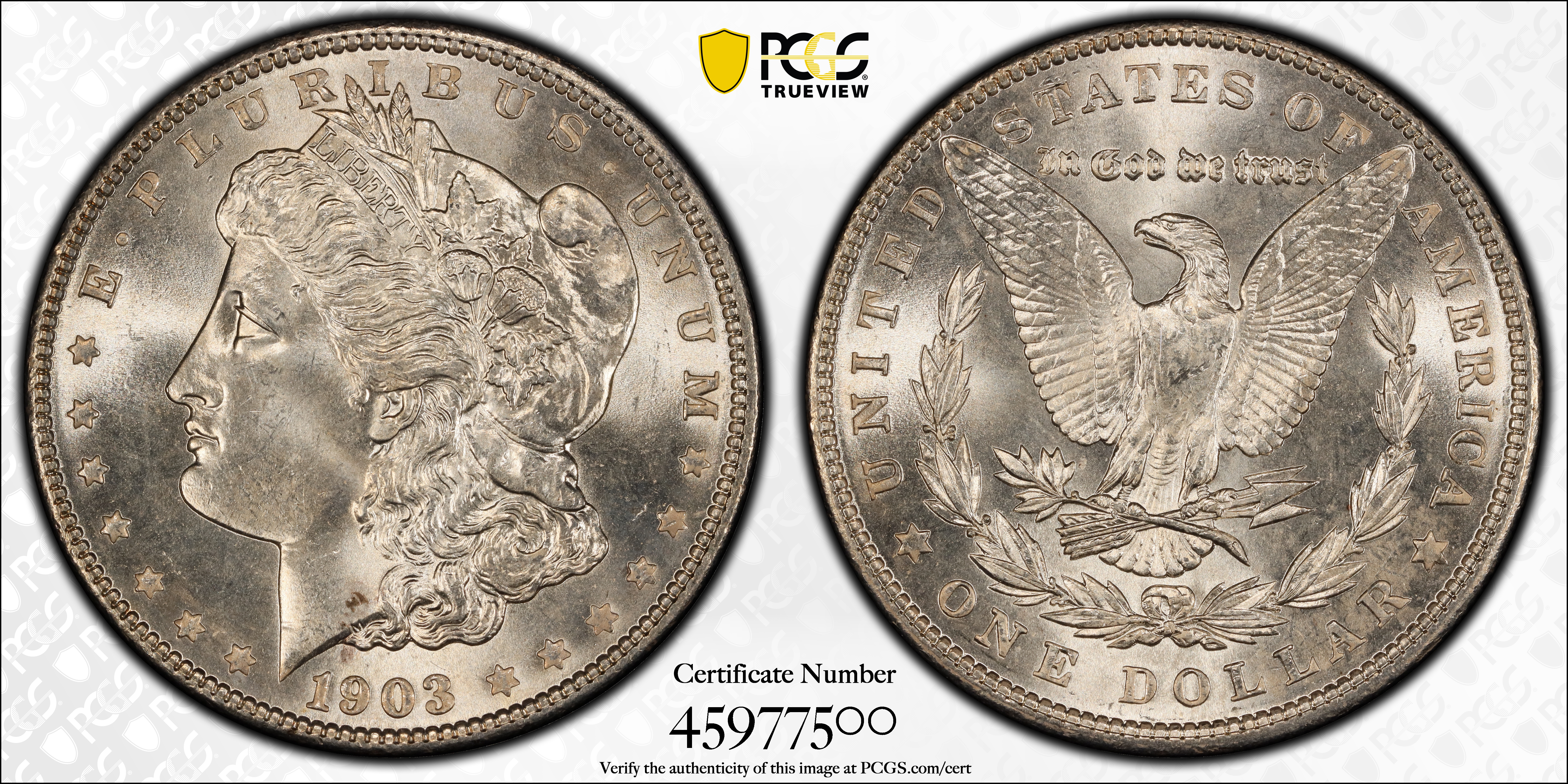 The 1903 Morgan Dollar is a very common coin thanks to numerous bags that have appeared on the market over the years. PCGS alone has certified over 13,000 examples of this date, with most falling into the MS64 to MS65 grade range. Superb examples are very scarce, but can be found occasionally in auction sales and in dealers' inventories. MS67 appears to be the last accessible grade.