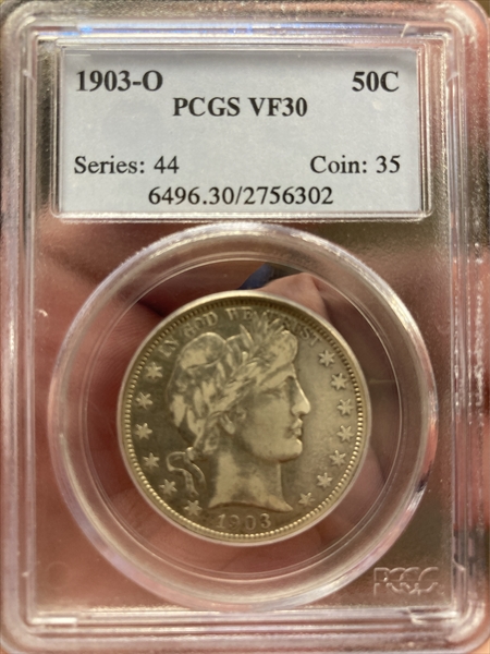 Among the O-Mint Barber Half Dollars, the 1903-O is one of the tougher issues. It is not as scarce as the 1901-O, 1902-O, and 1904-O, but it is either equal to or more rare than most of the other issues. The strike on the 1903-O is never full and there may be some weakness on the upper right shield lines, some of the obverse stars at lower right, on the eagle's right talon (viewer's right), or Liberty's mouth. Akers was correct in stating that this date is better-struck than most of the othe O-Mint Barber Half Dollars, but that does not mean it is anywhere near as strong as most of the Philadelphia and S-Mint issues. Notably well-struck examples include the former Norweb-Price-Duckor (PCGS MS67), a PCGS MS66 of unknown pedigree), and the PCGS MS65+ in the "Scrotag" Collection on the PCGS Set Registry.