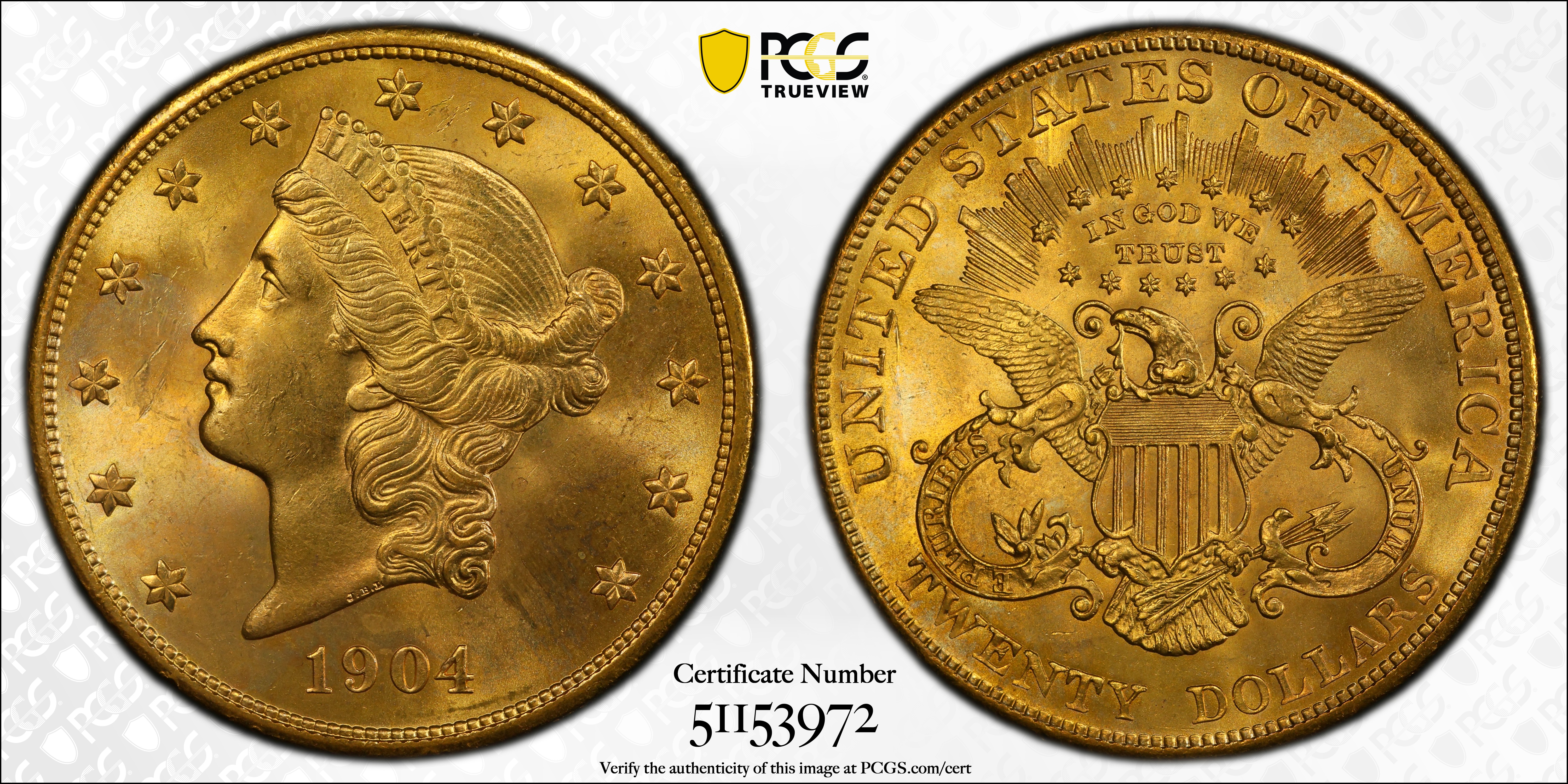 1904 $20 MS65 Certification #51153972, PCGS #9045