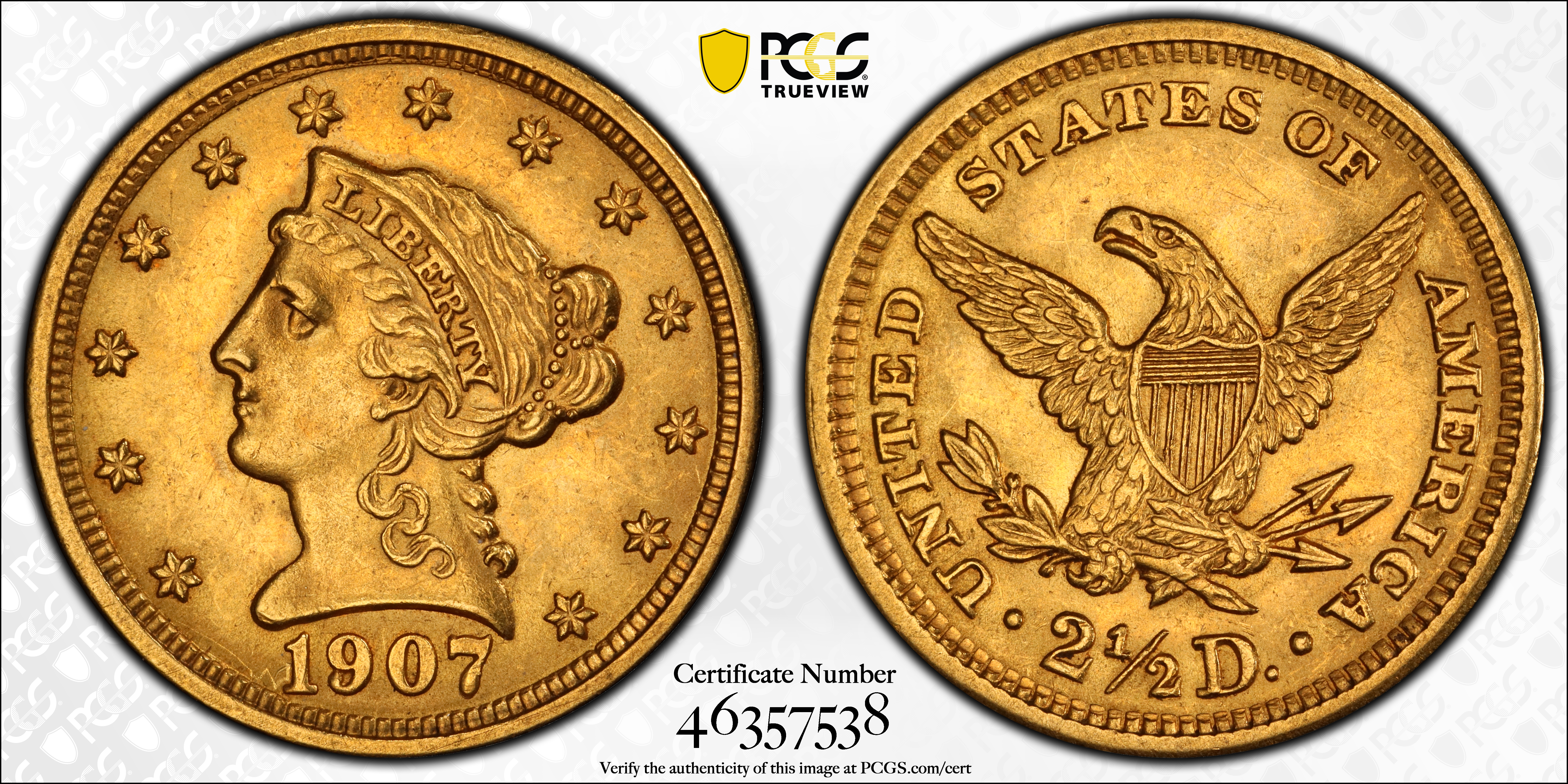 1907 $2.50 MS63 Certification #46357538, PCGS #7859