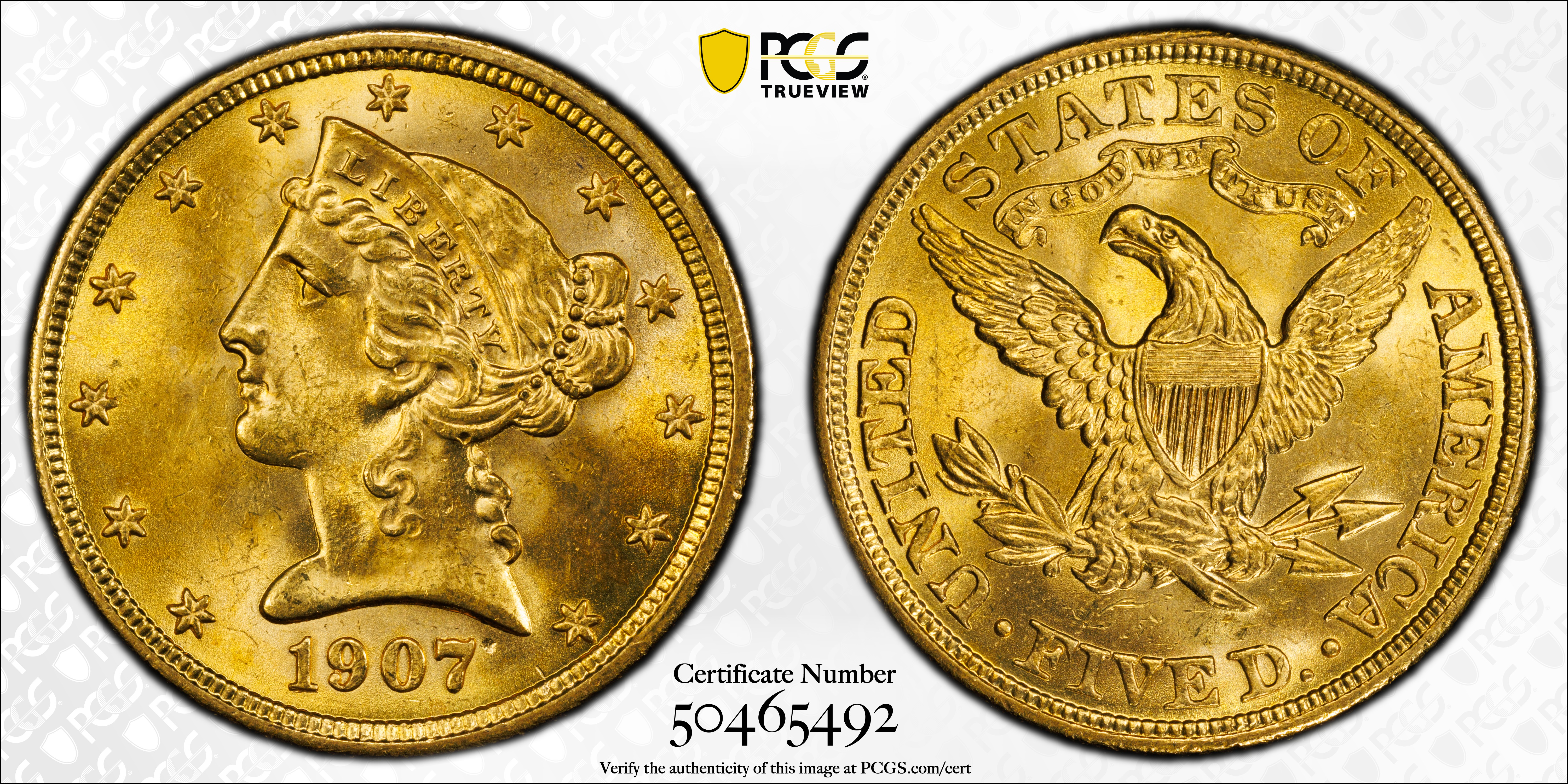 1907 $5 MS64+ Certification #50465492, PCGS #8416