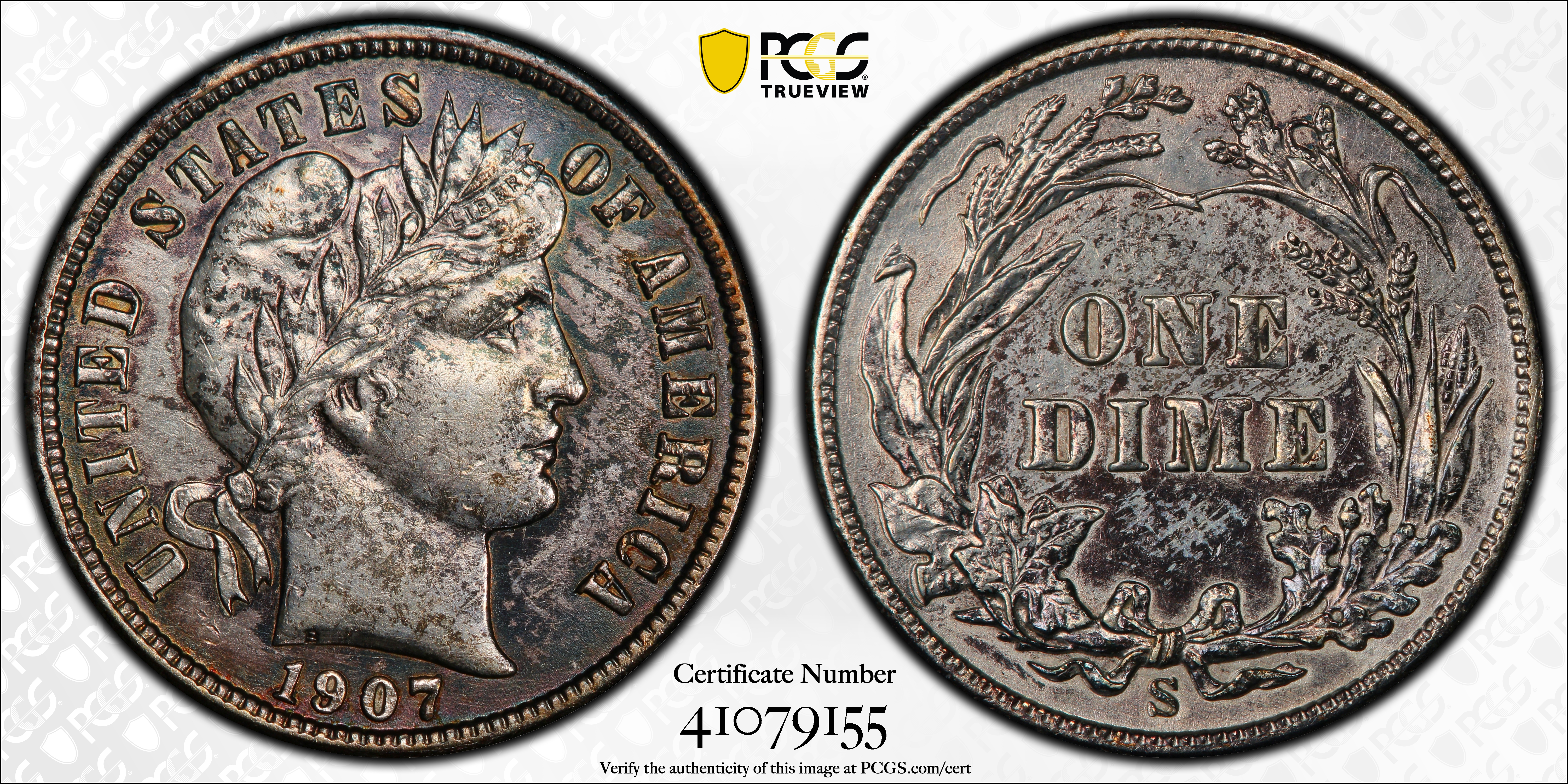 1907-S 10C N1 Certification #41079155, PCGS #4845