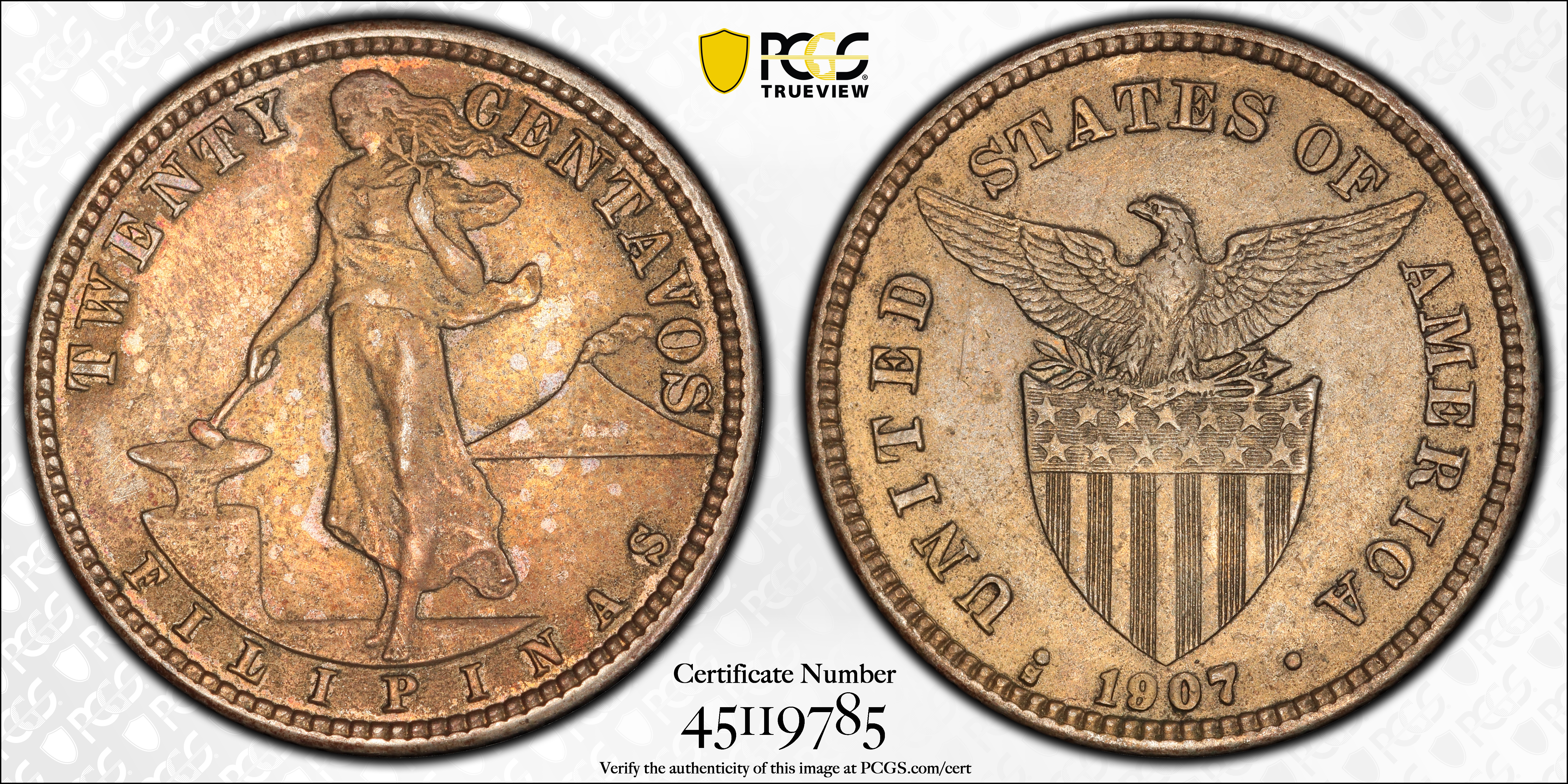 1907-S 20C AU55 Certification #45119785, PCGS #90300