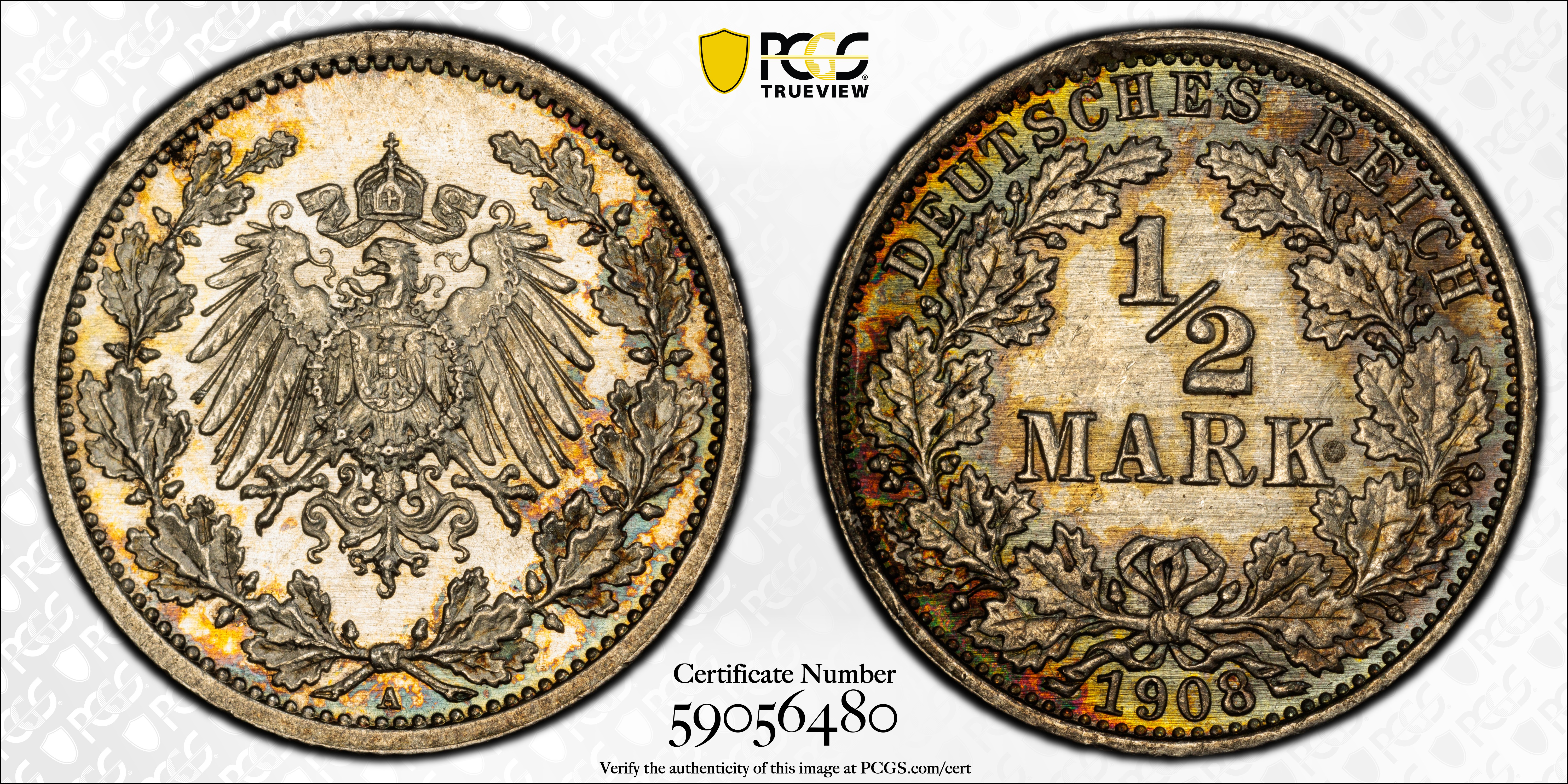 1908-A 1/2 Mk J-16 MS65 Certification #59056480, PCGS #300111