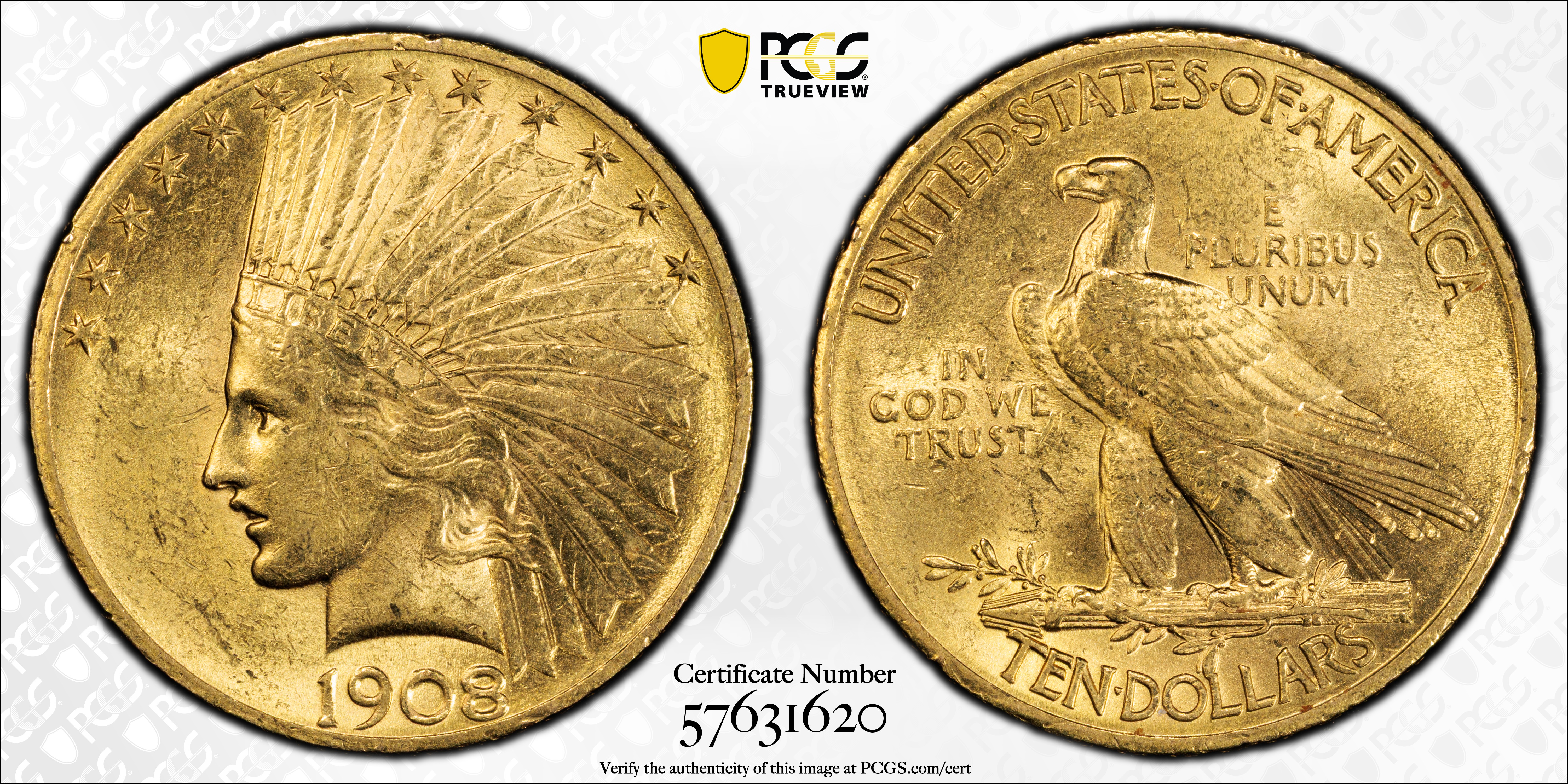 By Indian Head eagle standards, the 1908 With Motto is a "common" issue. In MS-63 or lower grade, examples can be found with relatively little difficulty. In MS-64, the issue becomes more difficult to locate, but there are still enough around that one can usually be found with a little effort. At the MS-65 level and above the 1908 With Motto is rare, but not especially so, and in any one year's period a handful or more true gems will turn up. There are some superb, nearly perfect examples of this issue in existence. For example, the piece that was in Florida dealer Marty Haber's personal type set would be graded MS-68 or MS-69 by the strictest standards, and there are others of similar quality.The 1908 With Motto is generally very sharply struck, and the lustre is typically very good to excellent. Most specimens have a satiny texture to the surface, and the color varies from rich yellow gold to medium greenish yellow gold to light orange and greenish gold. Like the 1908 No Motto, a top quality specimen of this issue is invariably extremely attractive with an excellent strike, and fine lustre and color.