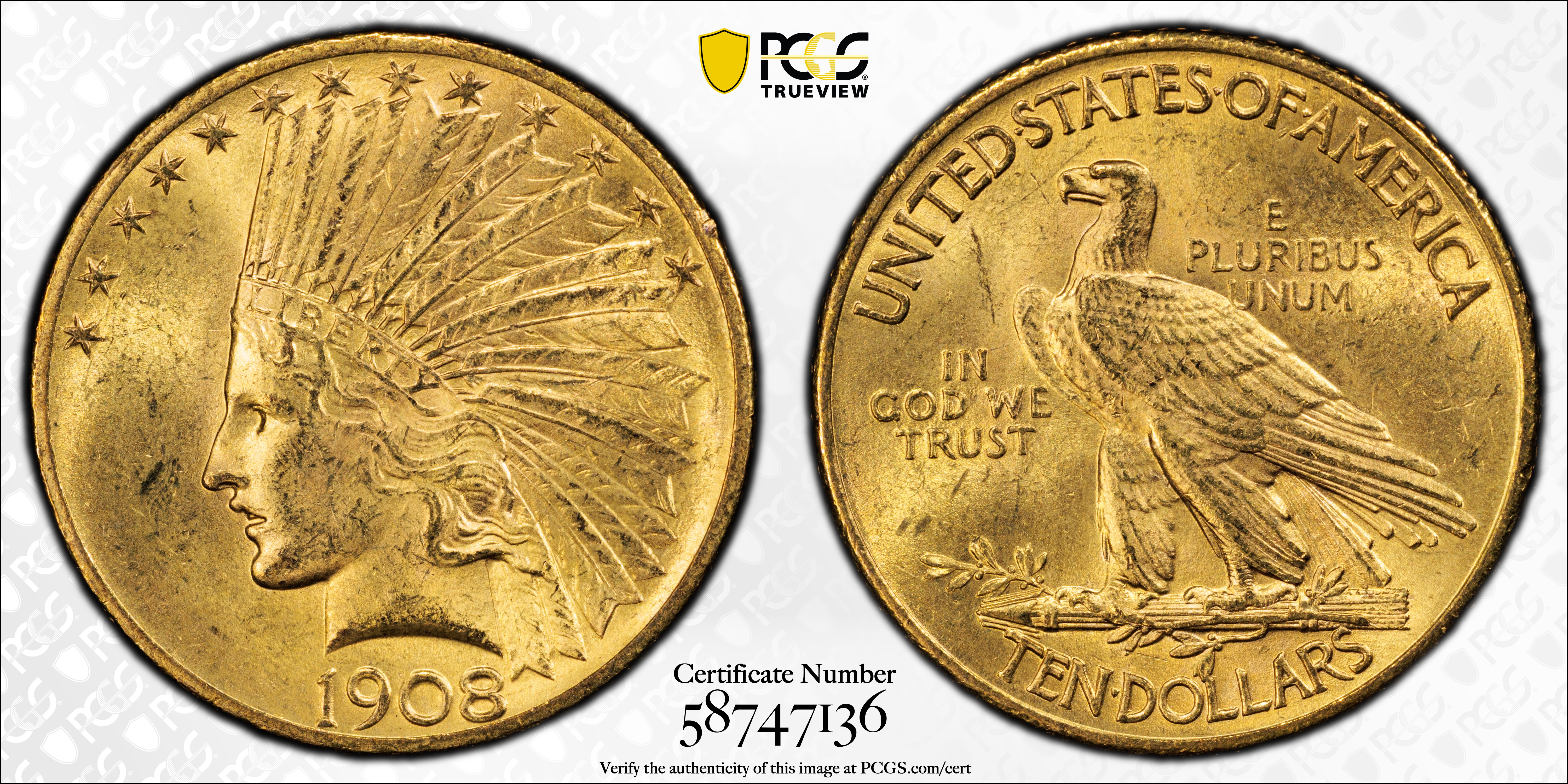 1908 $10 Motto MS64 Certification #58747136, PCGS #8859
