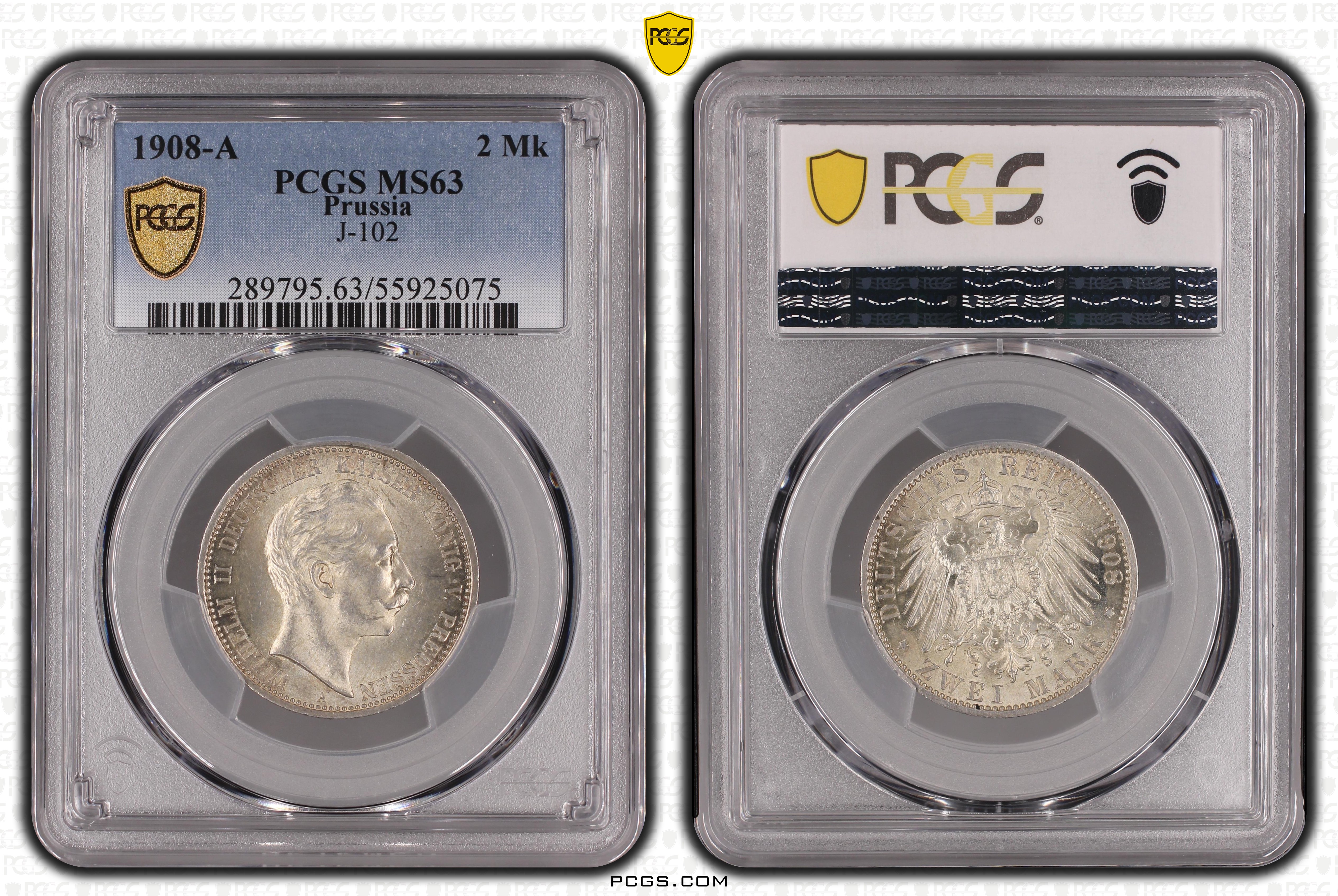 1908-A 2 Mk J-102 MS63 Certification #55925075, PCGS #289795