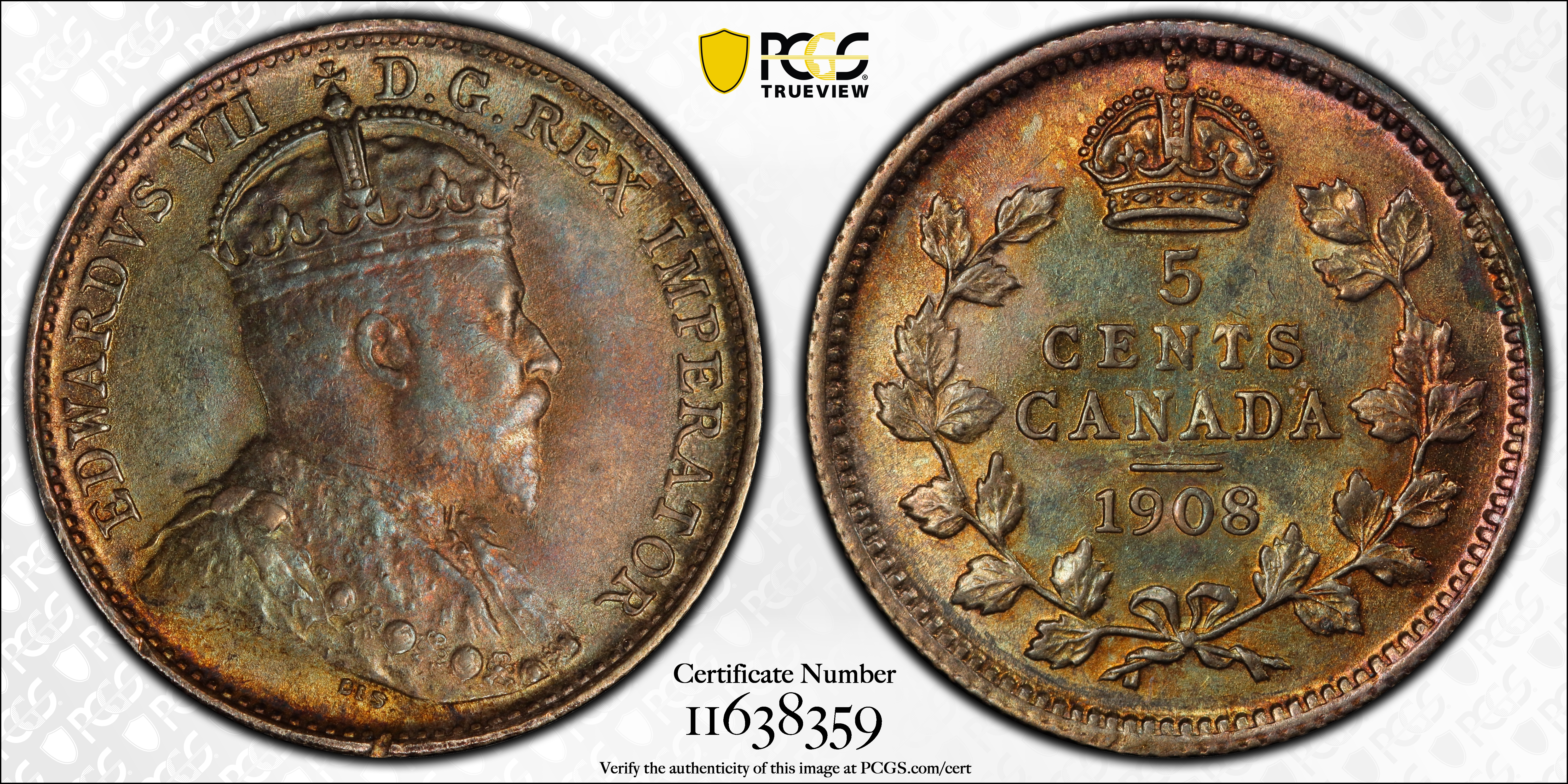 1908 5C Large 8 MS64 Certification #11638359, PCGS #165908