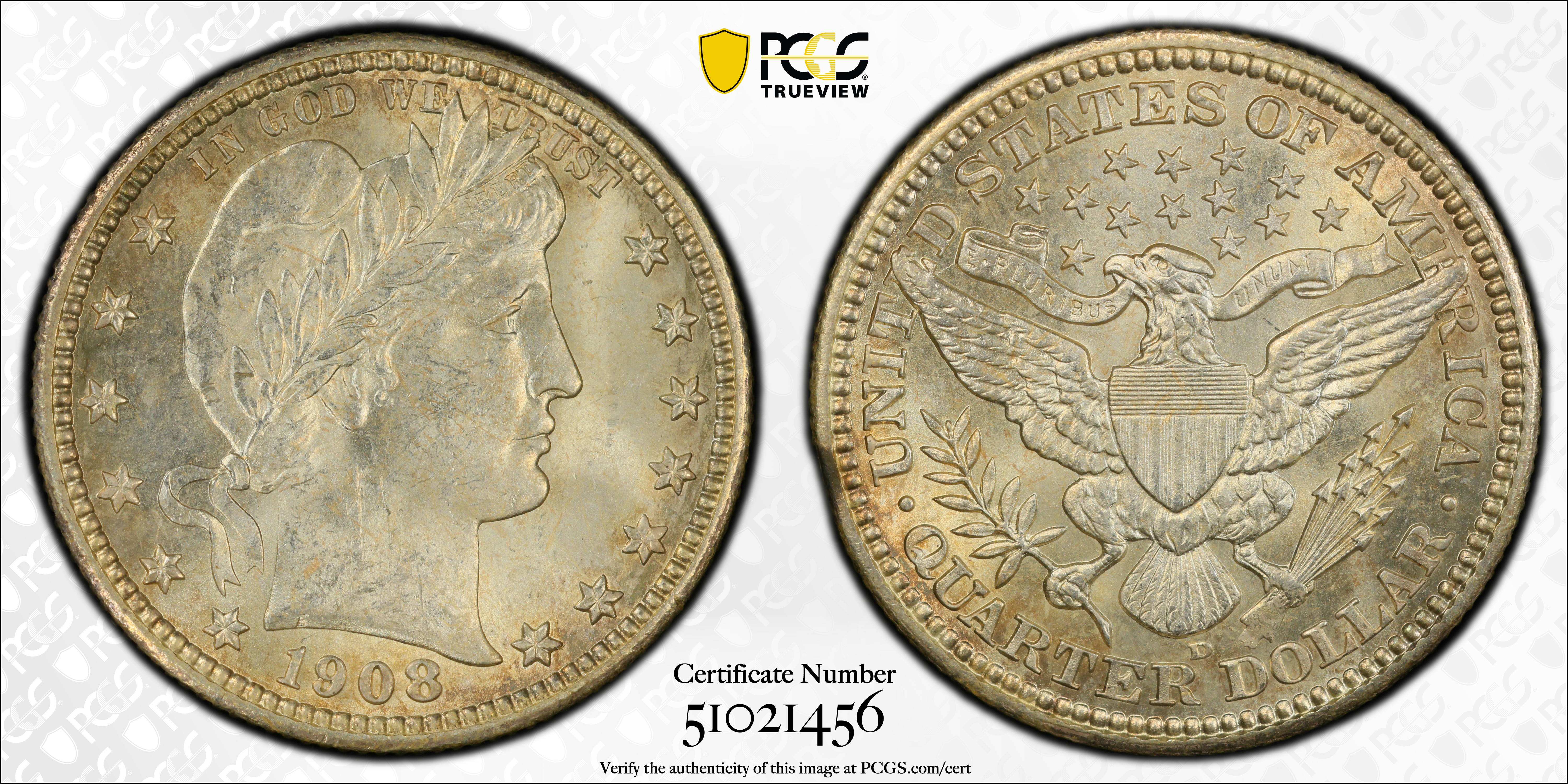 The 1908-D Barber Quarter is a great collectible coin because it is plentiful and it often comes nice. Most examples come well struck and many of the top coins come with remarkably colorful toning. In Mint State, the most common grades are MS63 and MS64. Gems can be found without too much difficulty, but above MS66, this date is a true condition-rarity. The best example is the NGC MS68 from the Eliasberg and Gardner collections.