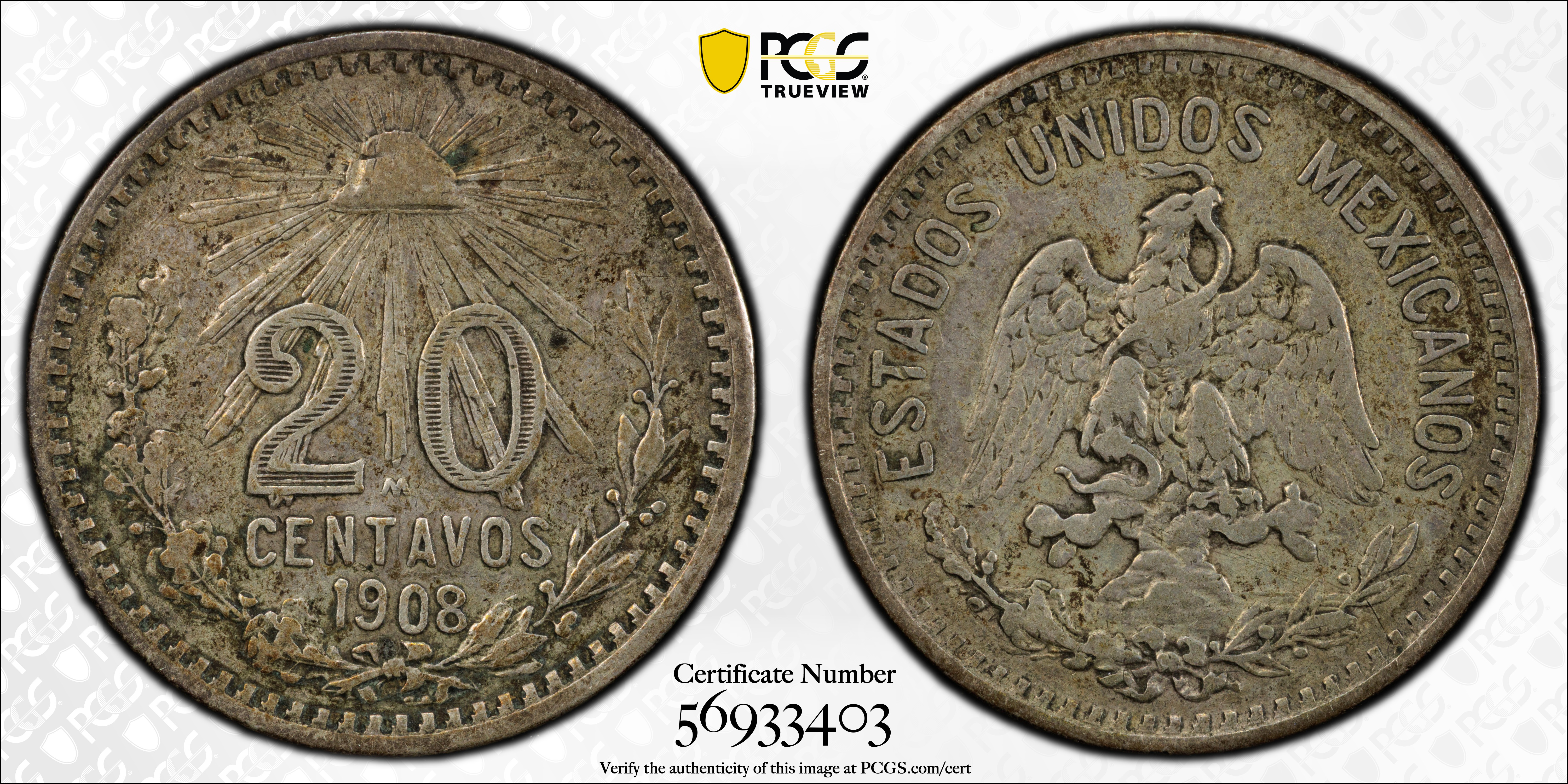 1908-M 20C VF35 Certification #56933403, PCGS #525475