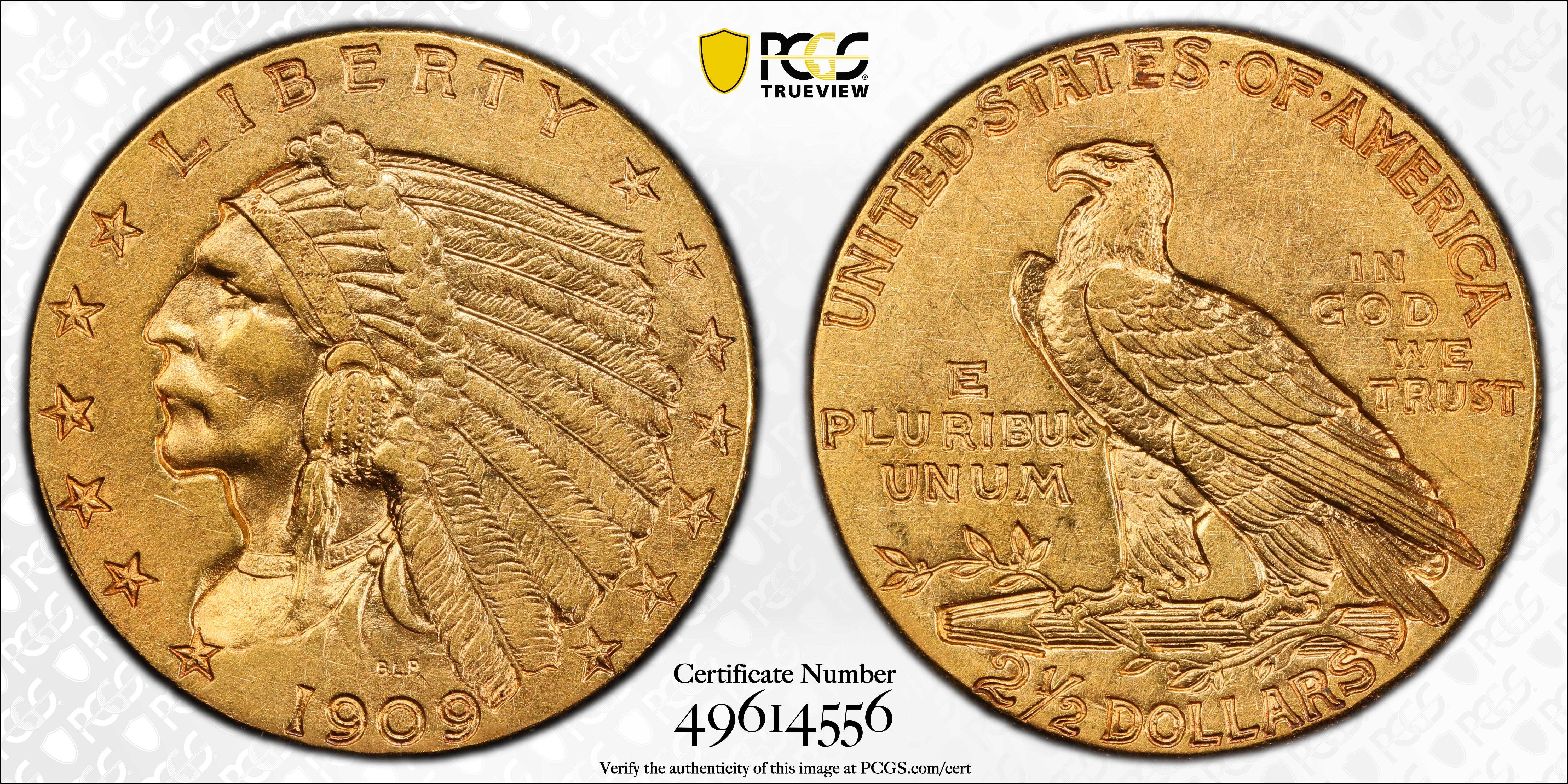 1909 $2.50 AU55 Certification #49614556, PCGS #7940
