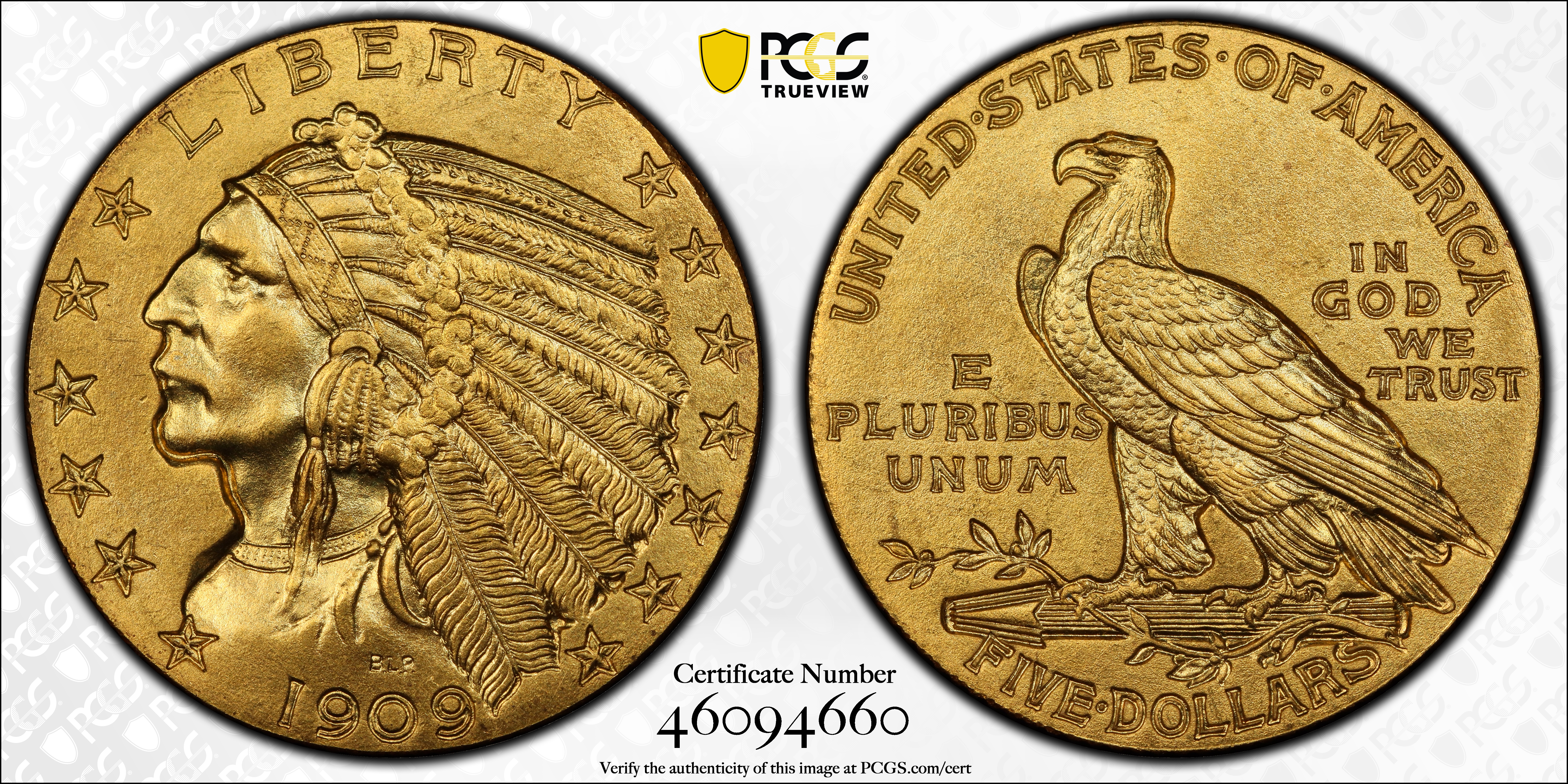 1909 $5 PR67 Certification #46094660, PCGS #8540