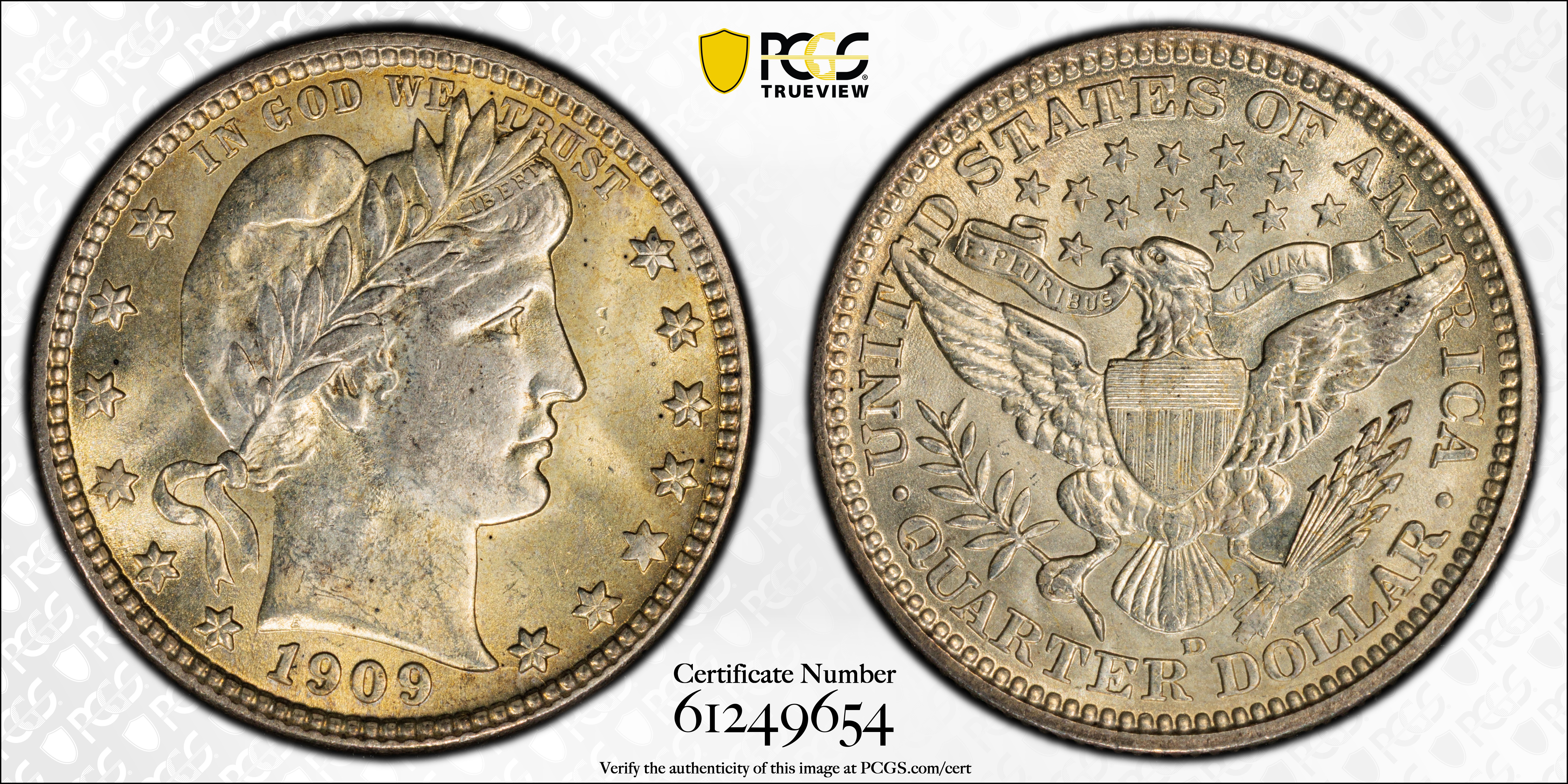1909-D 25C MS63 Certification #61249654, PCGS #5654