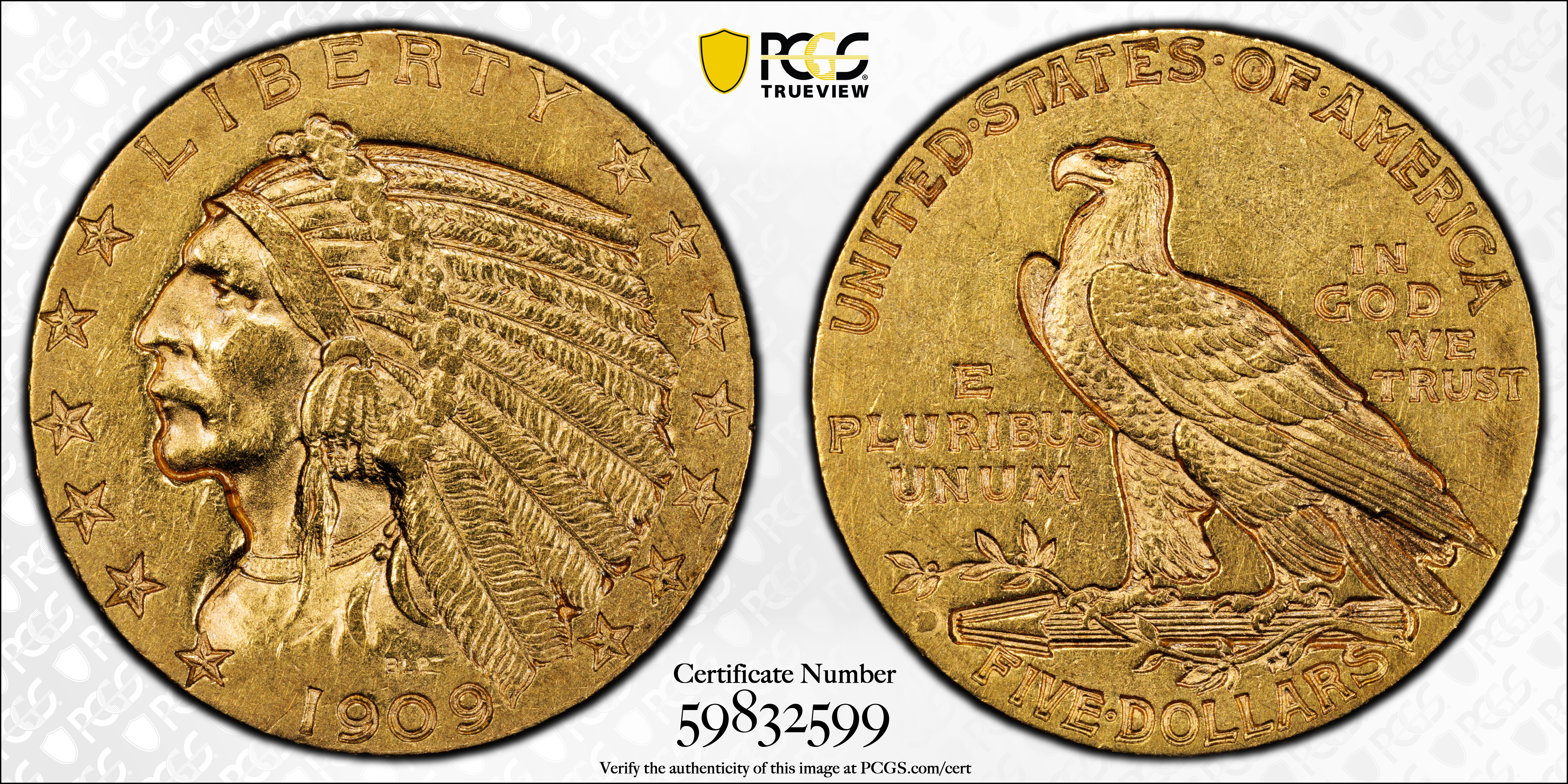 1909-D $5 AU55 Certification #59832599, PCGS #8514
