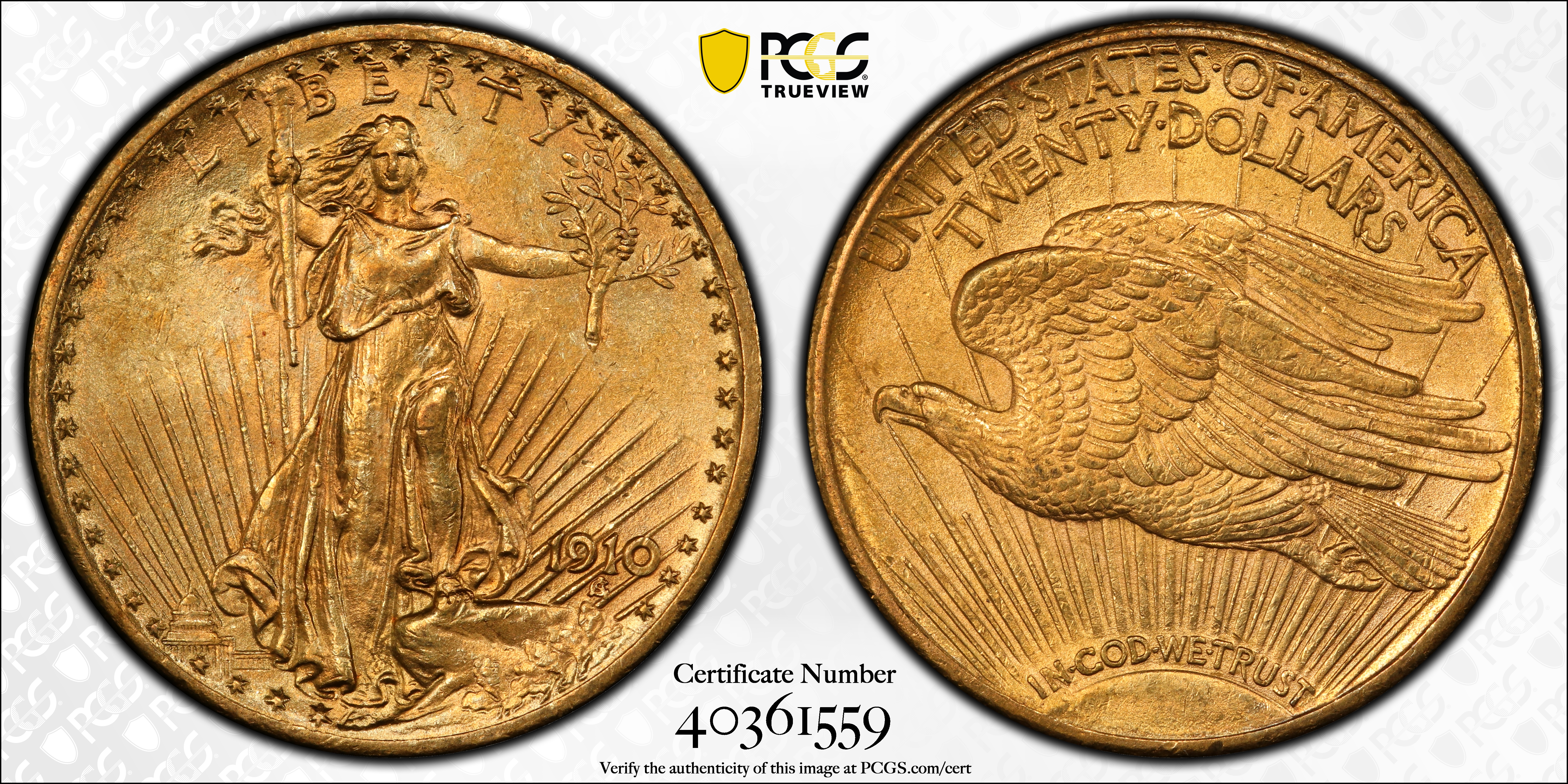 1910 $20 MS63 Certification #40361559, PCGS #9154