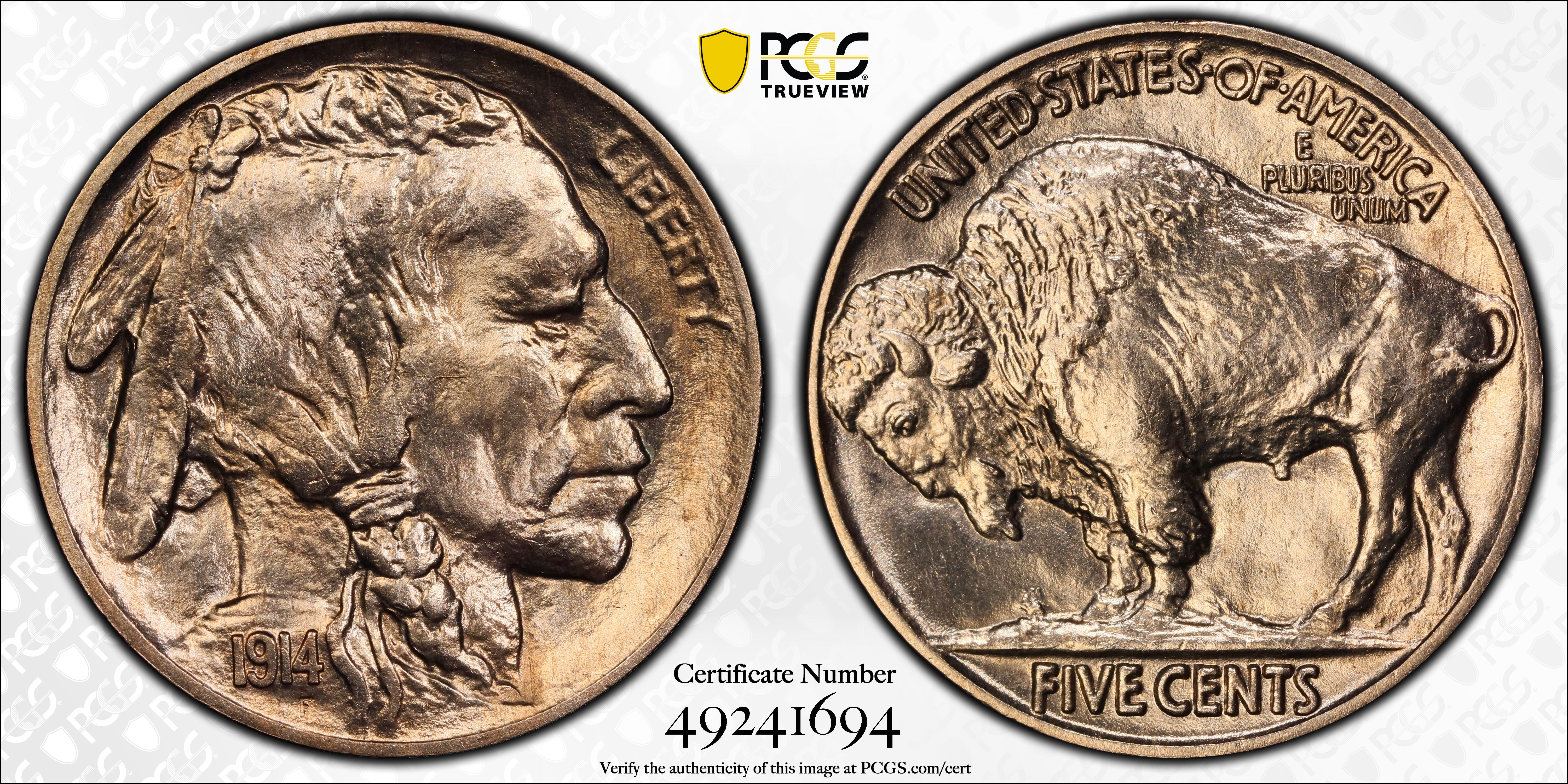 The 1914 Buffalo nickel is fairly available in all grades. In gem condition, it is rarer than the 1913 Type 2, 1915 and 1916. Strike is usually sharp, as is the case with most Philadelphia mint Buffalos. Luster on mint state examples is satiny and can be excellent.PCGS #