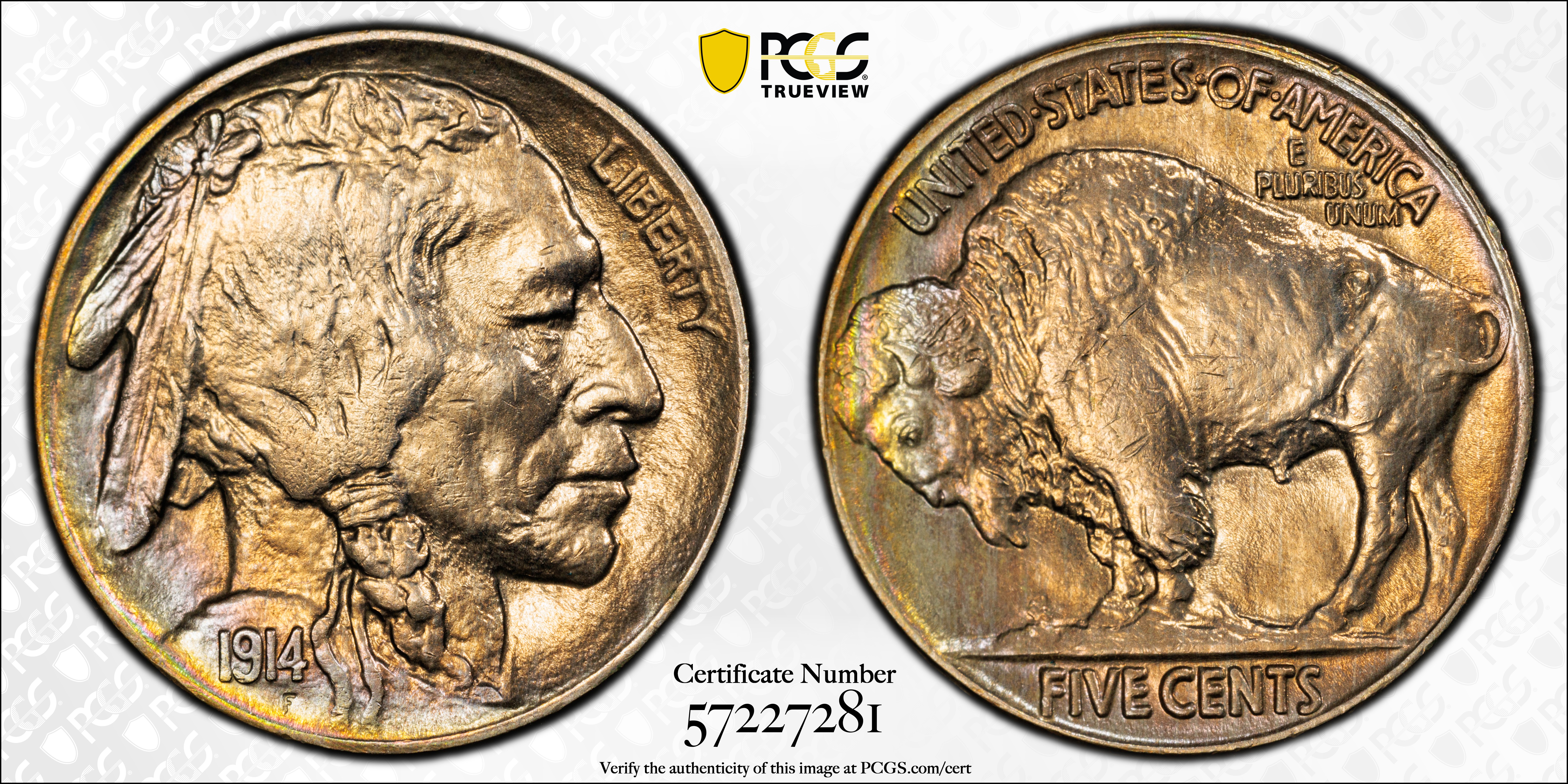 The 1914 Buffalo nickel is fairly available in all grades. In gem condition, it is rarer than the 1913 Type 2, 1915 and 1916. Strike is usually sharp, as is the case with most Philadelphia mint Buffalos. Luster on mint state examples is satiny and can be excellent.PCGS #