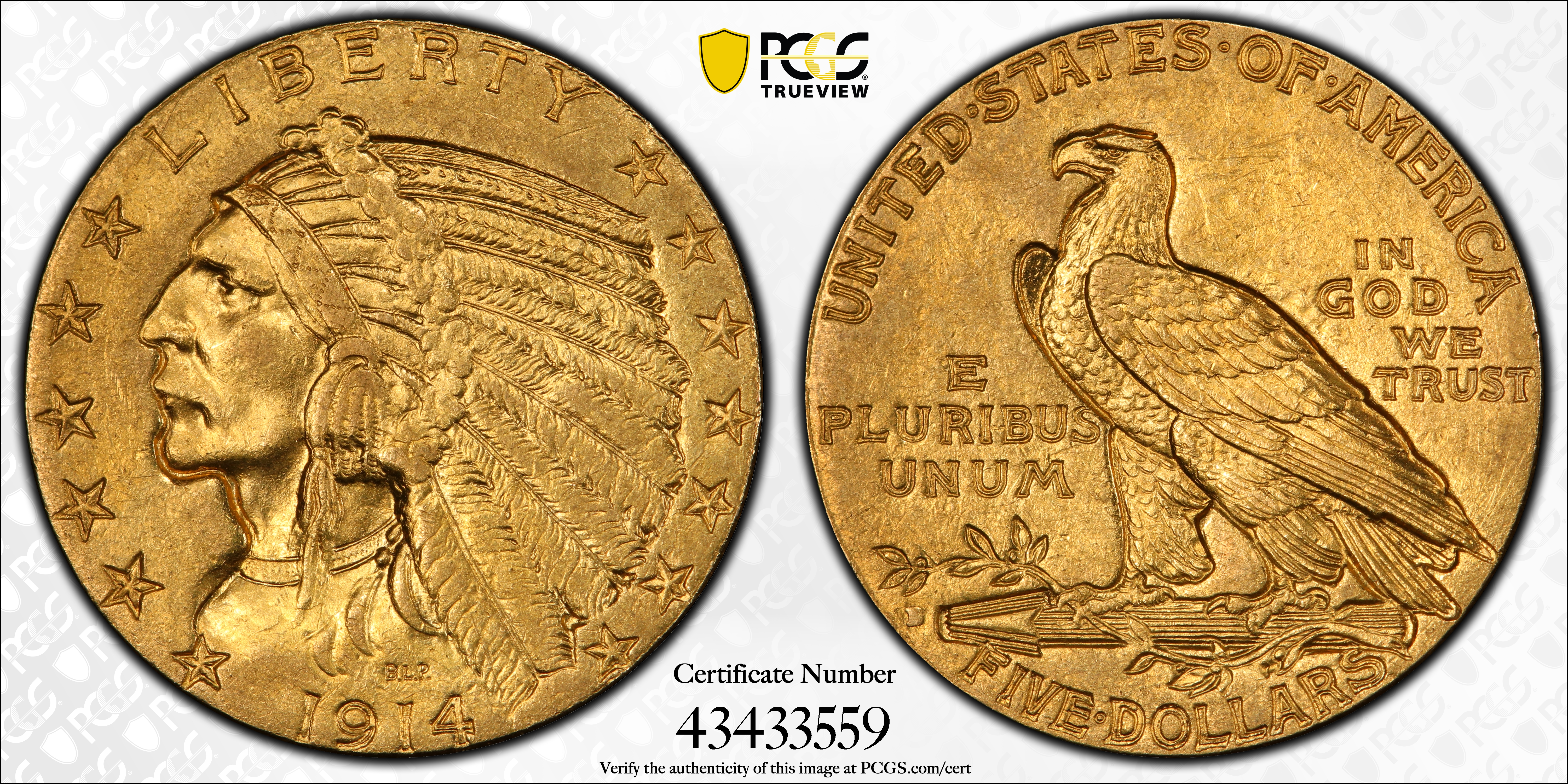 1914-D $5 AU55 Certification #43433559, PCGS #8528