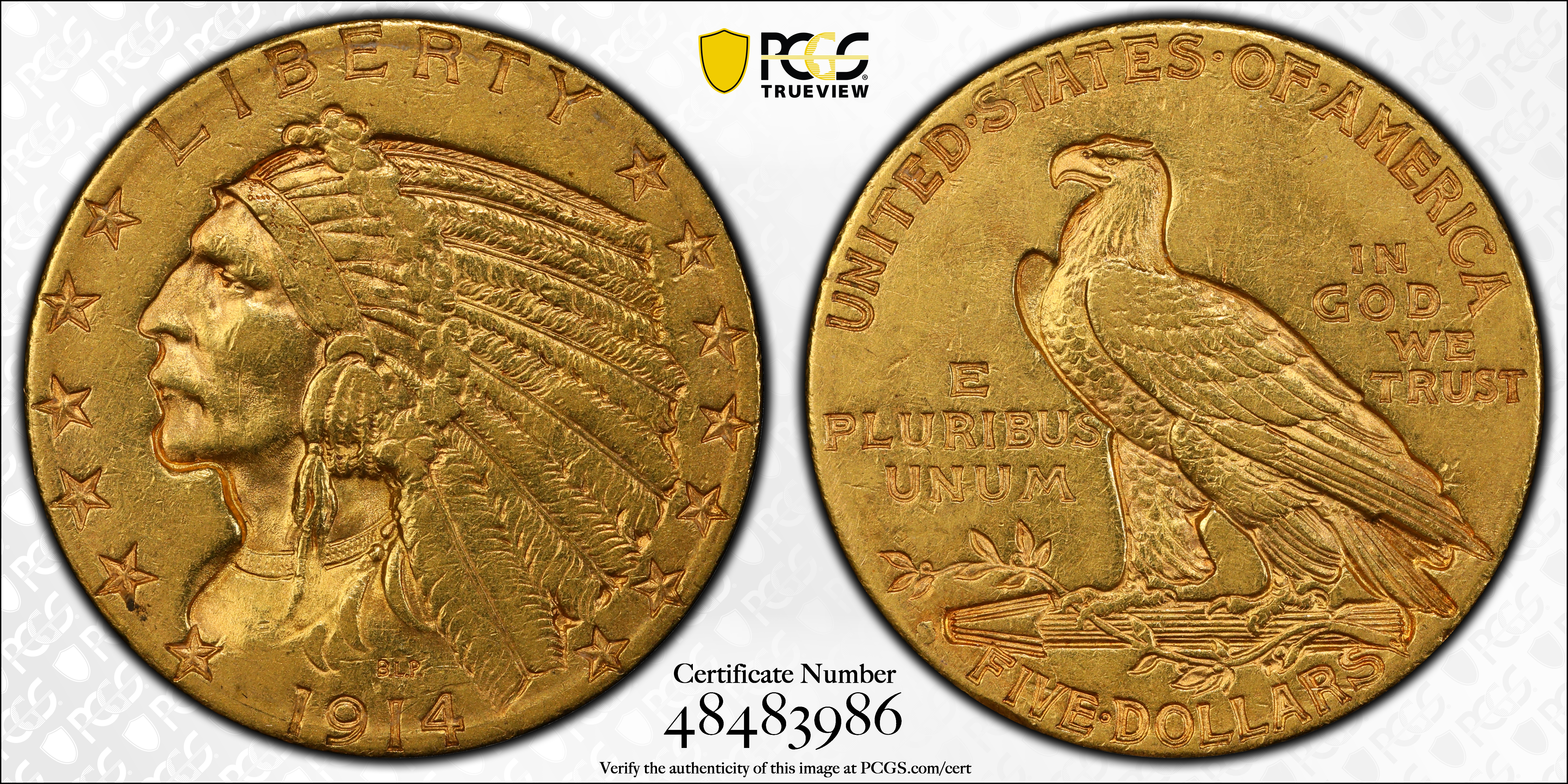 1914-S $5 AU55 Certification #48483986, PCGS #8529