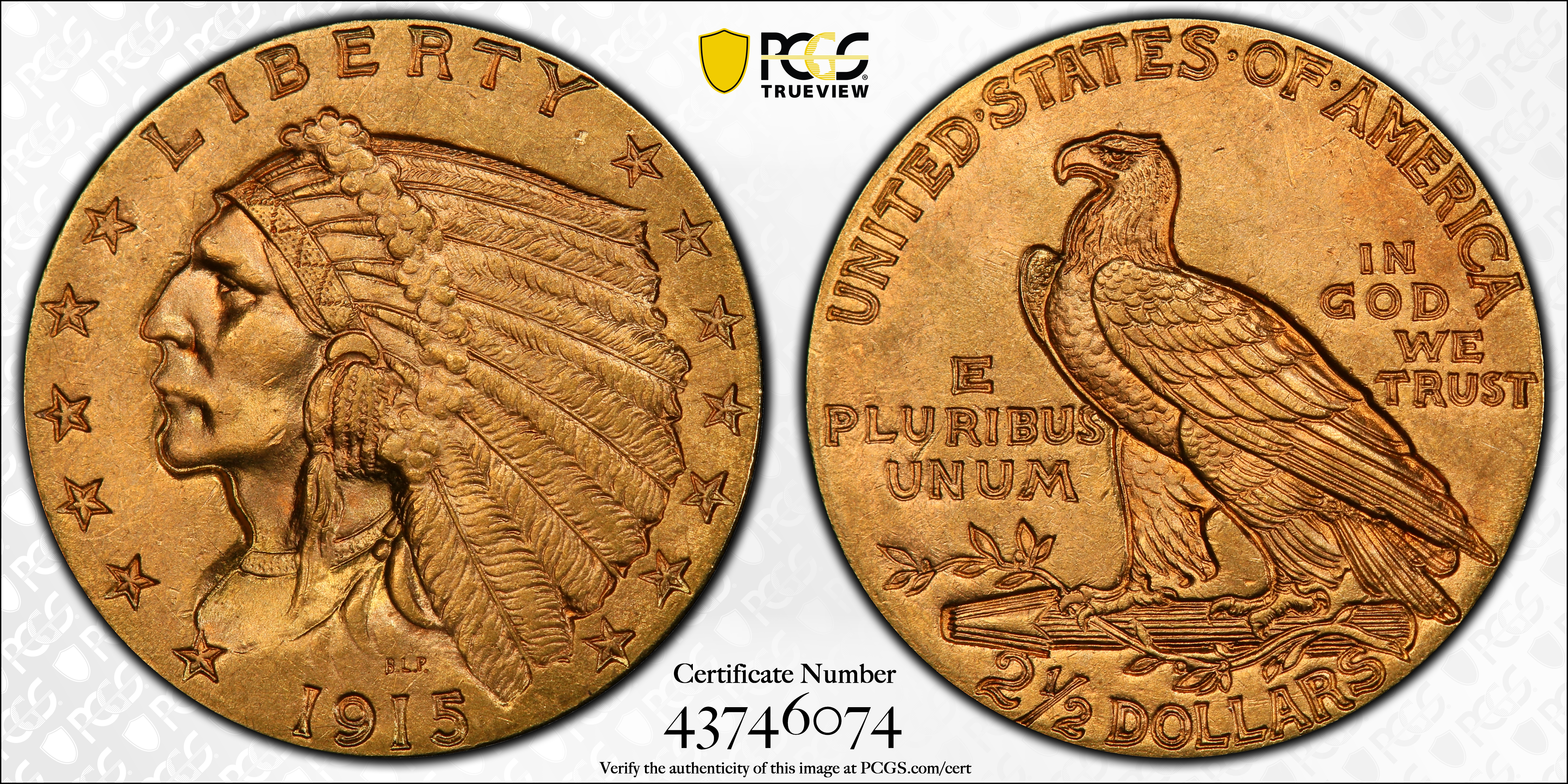 1915 $2.50 MS63 Certification #43746074, PCGS #7948