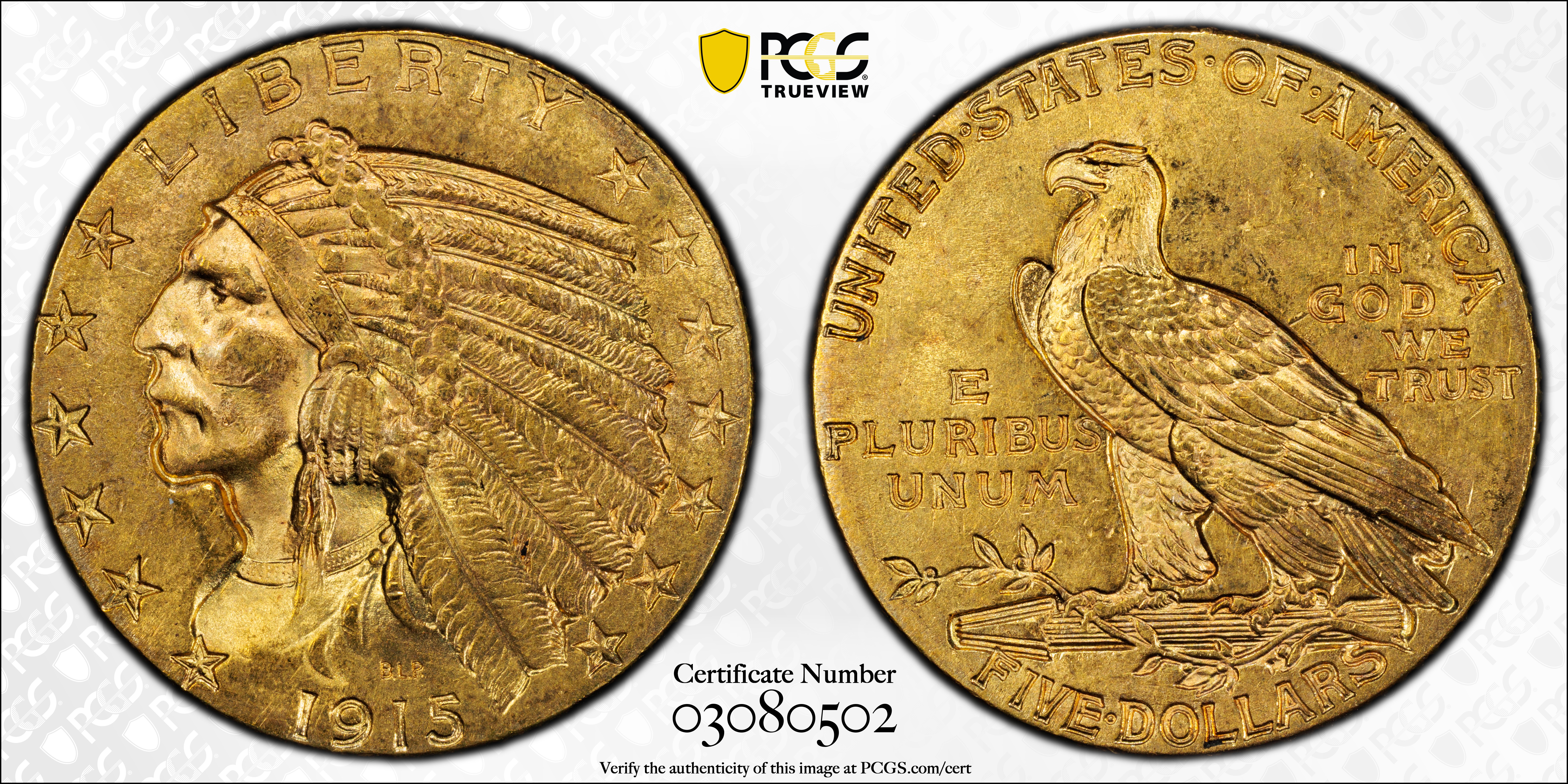 The 1915 is one of the more common issues of the series and is the easiest to locate in gem condition, other than the 1908. There are quite a few gems around as well as a small number of superb, nearly perfect quality examples. Nevertheless, the 1915, like all Indian head half eagles, still must be considered to be rare in MS-64 or higher grade. All Indian Head half eagles are rare in full MS-65 condition making this the rarest gold type of the 20th century by far.Overall, this is one of the better looking issues of the series, and high grade ones are most often really attractive. The typical 1915 is very sharply struck with very finely granular surfaces, great lustre and superb color, usually rich greenish gold and orange although some coppery or reddish gold specimens also exist.