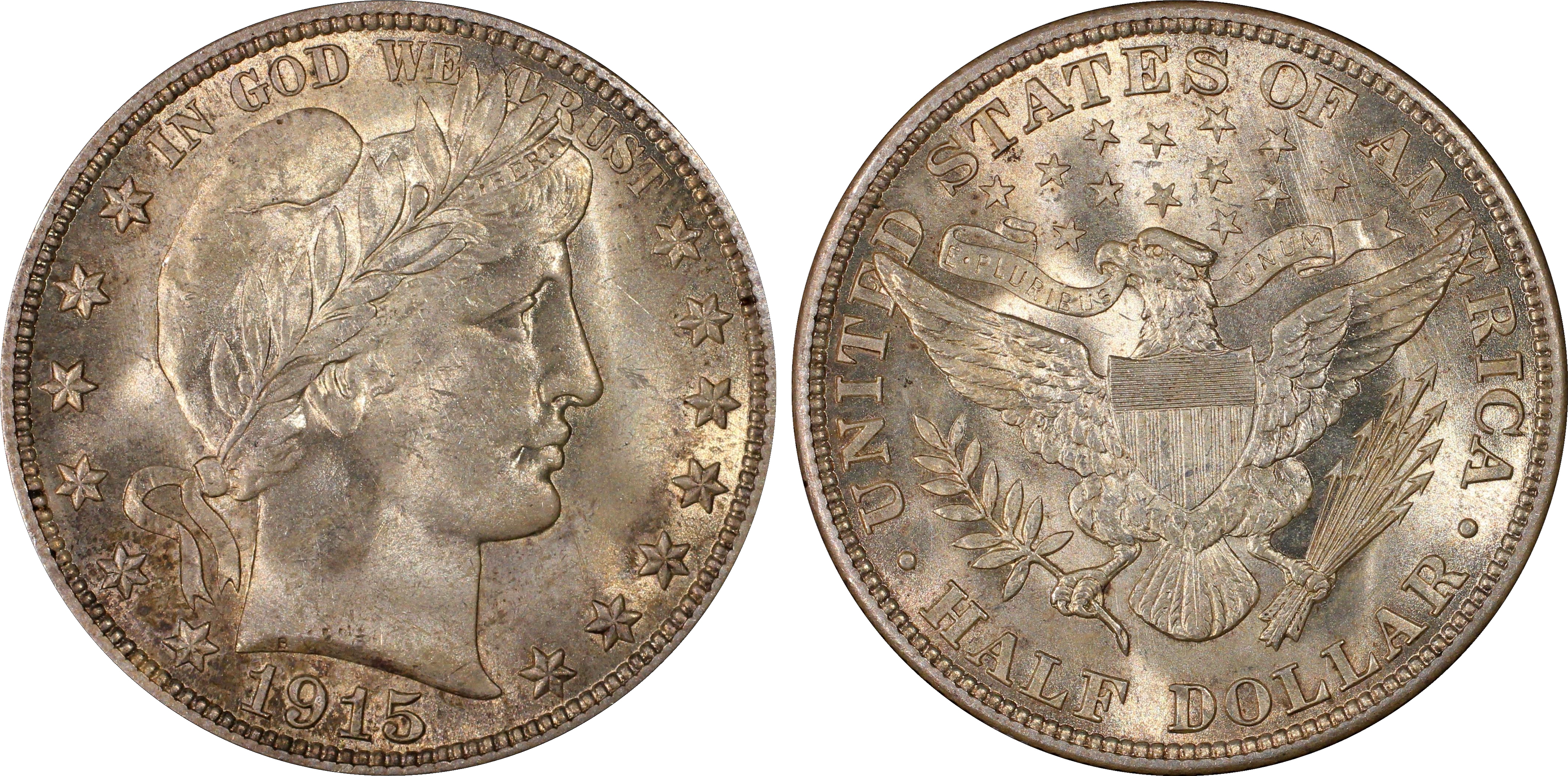 The popularity of the 1915 Half Dollar is evident in the large population of certified examples. Despite being one of the rarer dates in the series, there are more PCGS-certified 1915 Half Dollars than any other date -- including the first-year-of-issue 1892. Not unexpectedly, most of the certified examples are circulated, as Mint State examples of the 1915 are just as scarce as most of the other dates in the series. Mint State 1915 Half Dollars are slightly morre rare than the 1914, but not as rare as the 1913. MS64 examples are the most plentiful, followed by MS63's. Gems are scarce, but they show up in the marketplace with relative frequency. MS66 and better examples are very rare, with just a small handful in MS66, one or two in MS66+, and none in MS67.