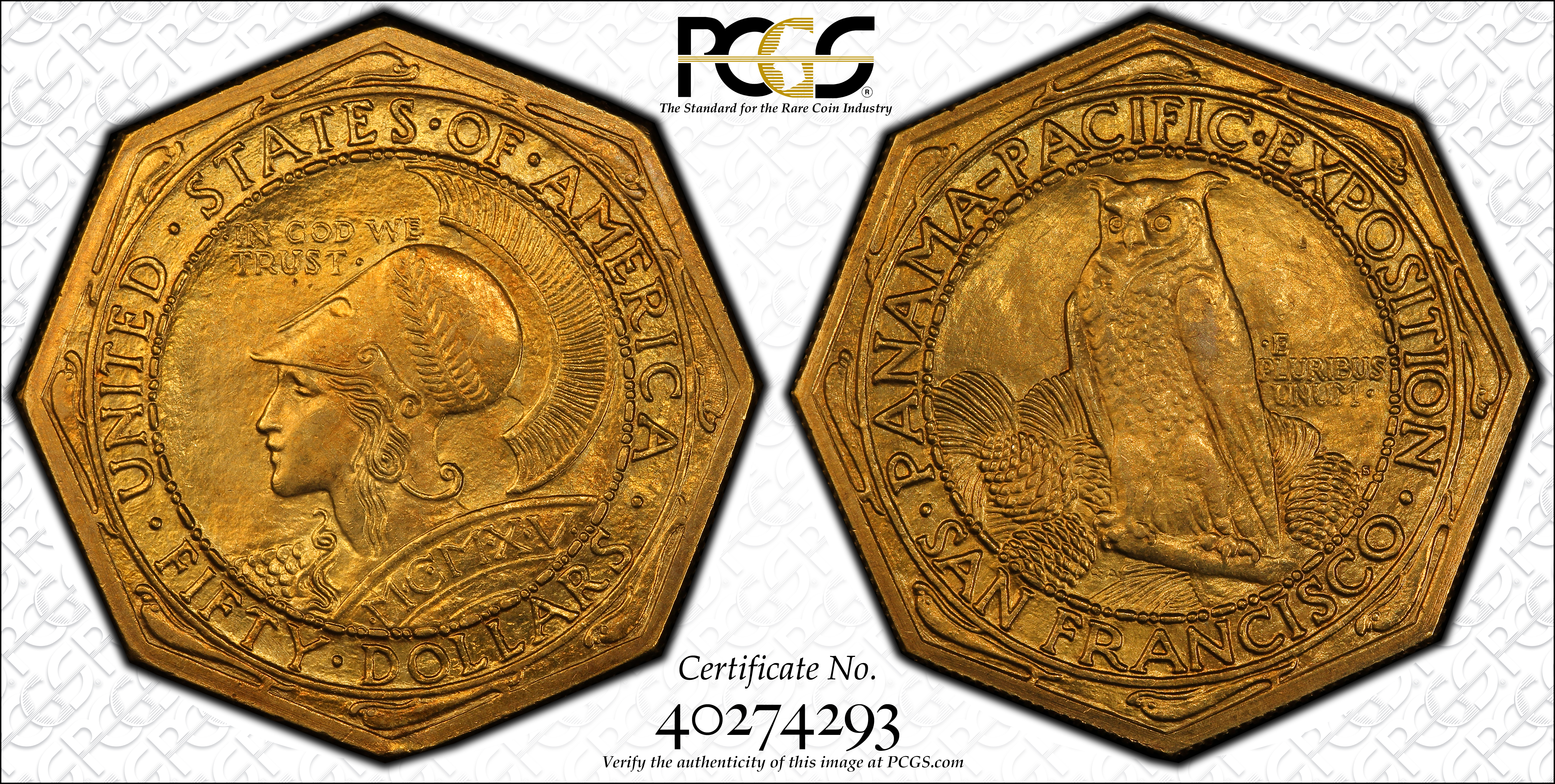 1915-S $50 Panama-Pacific, Octagonal MS64 Certification #40274293, PCGS #7452