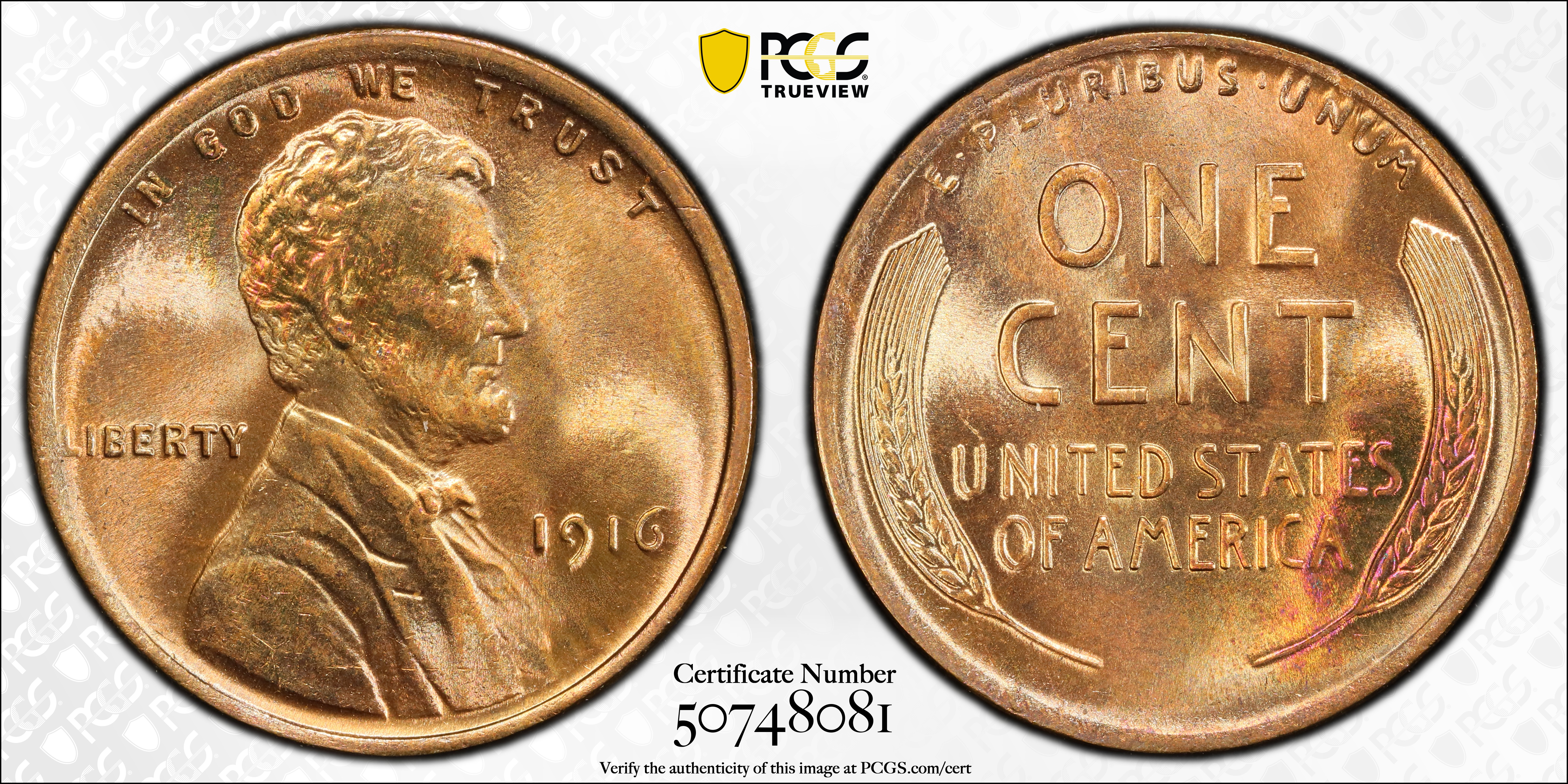 1916 1C, RD MS65RD Certification #50748081, PCGS #2488