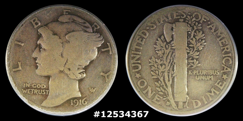 1916-D 10C VG10 Certification #12534367, PCGS #4906