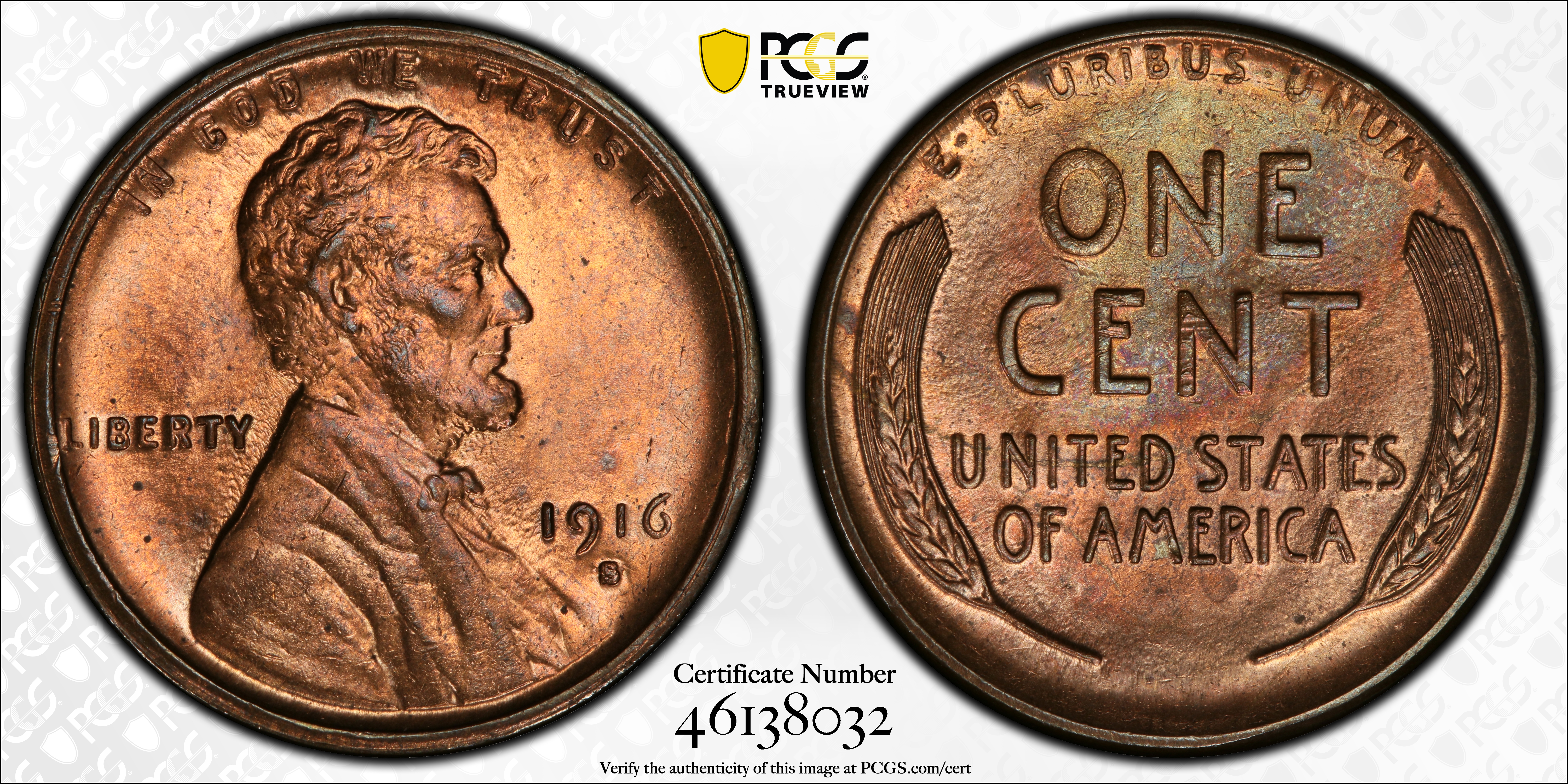 1916-S 1C, RD MS65RD Certification #46138032, PCGS #2494
