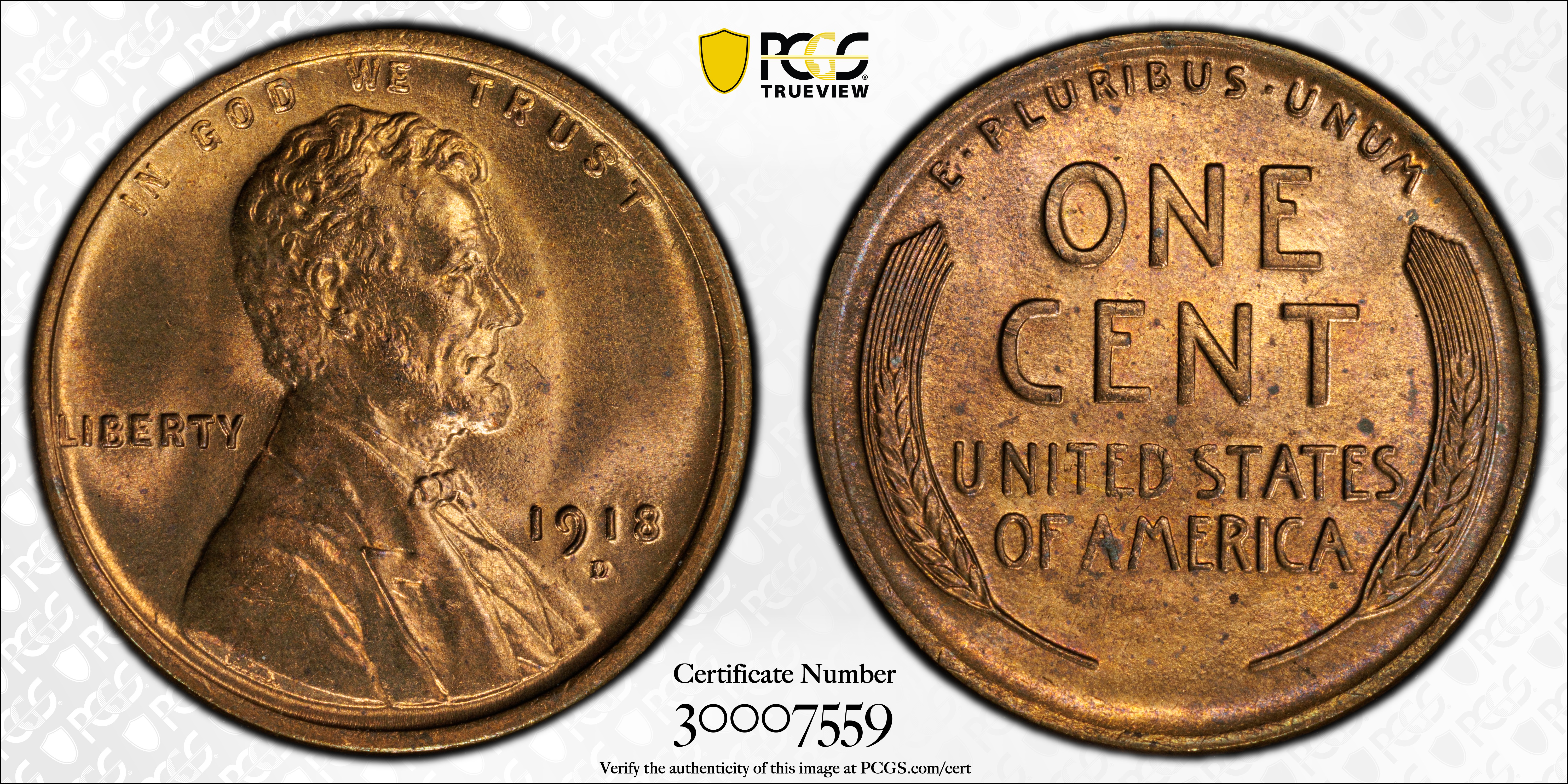 1918-D 1C, RD MS64RD Certification #30007559, PCGS #2509