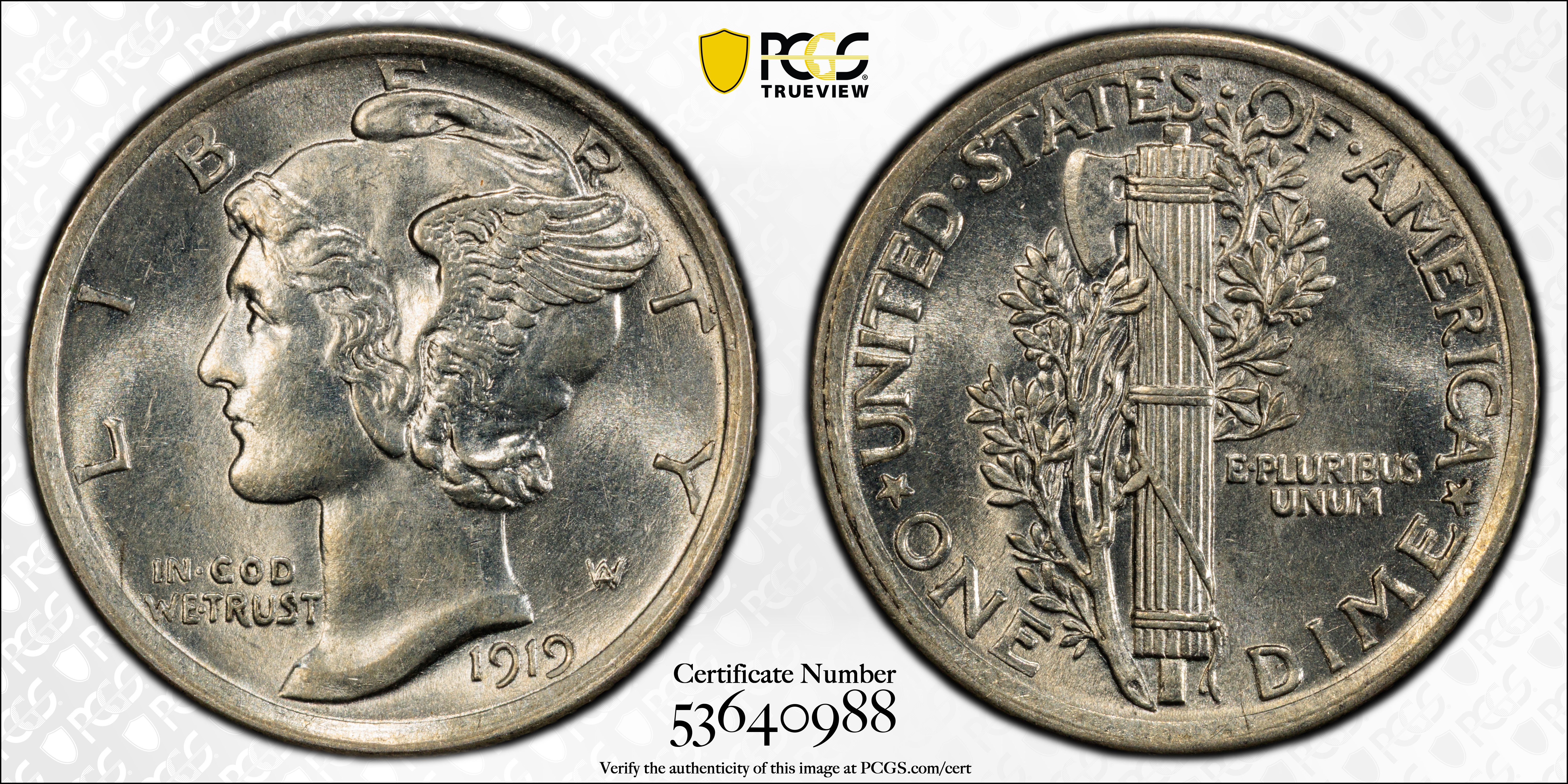 1919 10C, FB AU58FB Certification #53640988, PCGS #4923