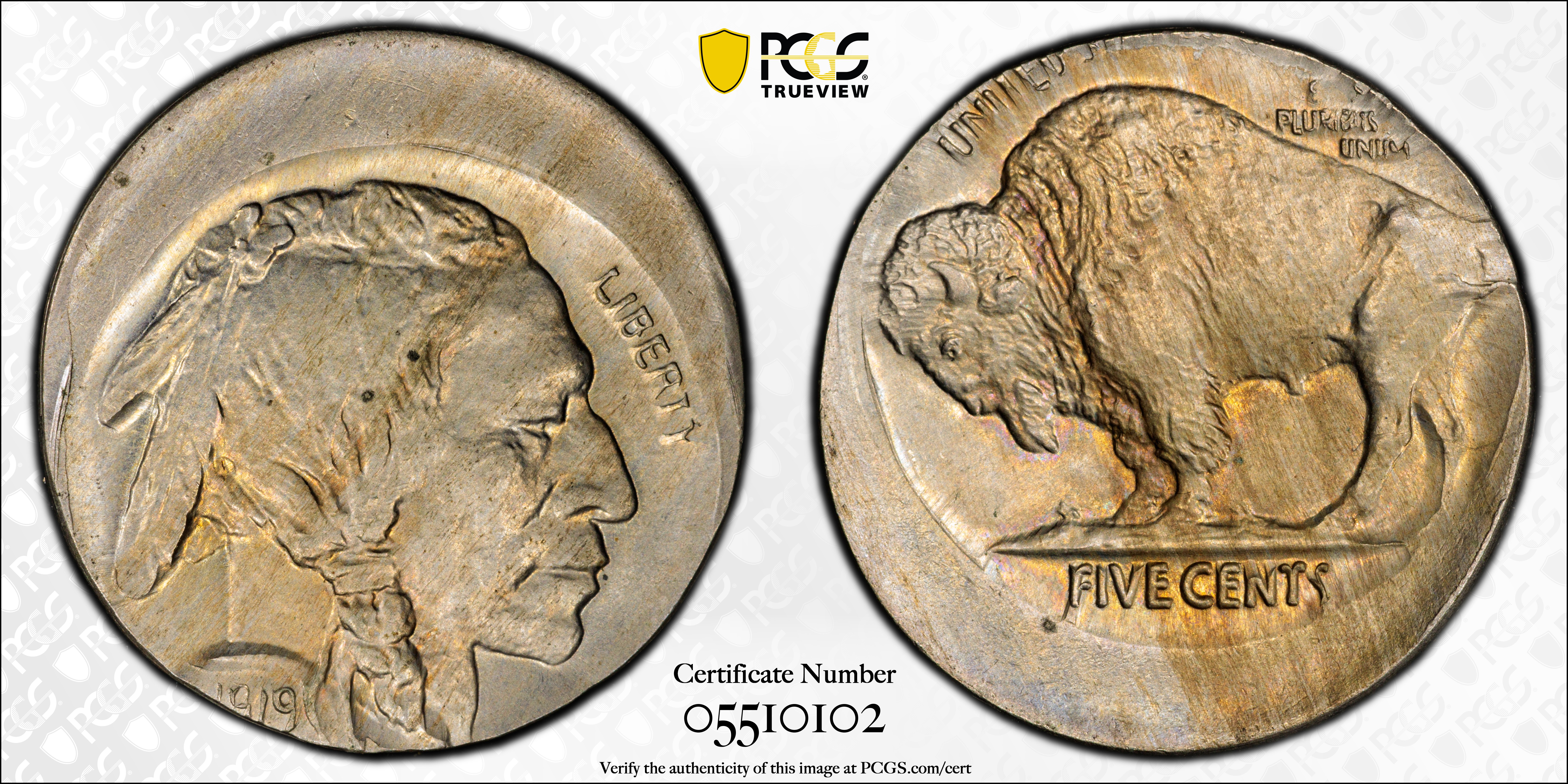 A very nice Mint State 64, 1919 Buffalo Nickel that is 20% Off Center directly to the South. This is a very clean Off Center example.