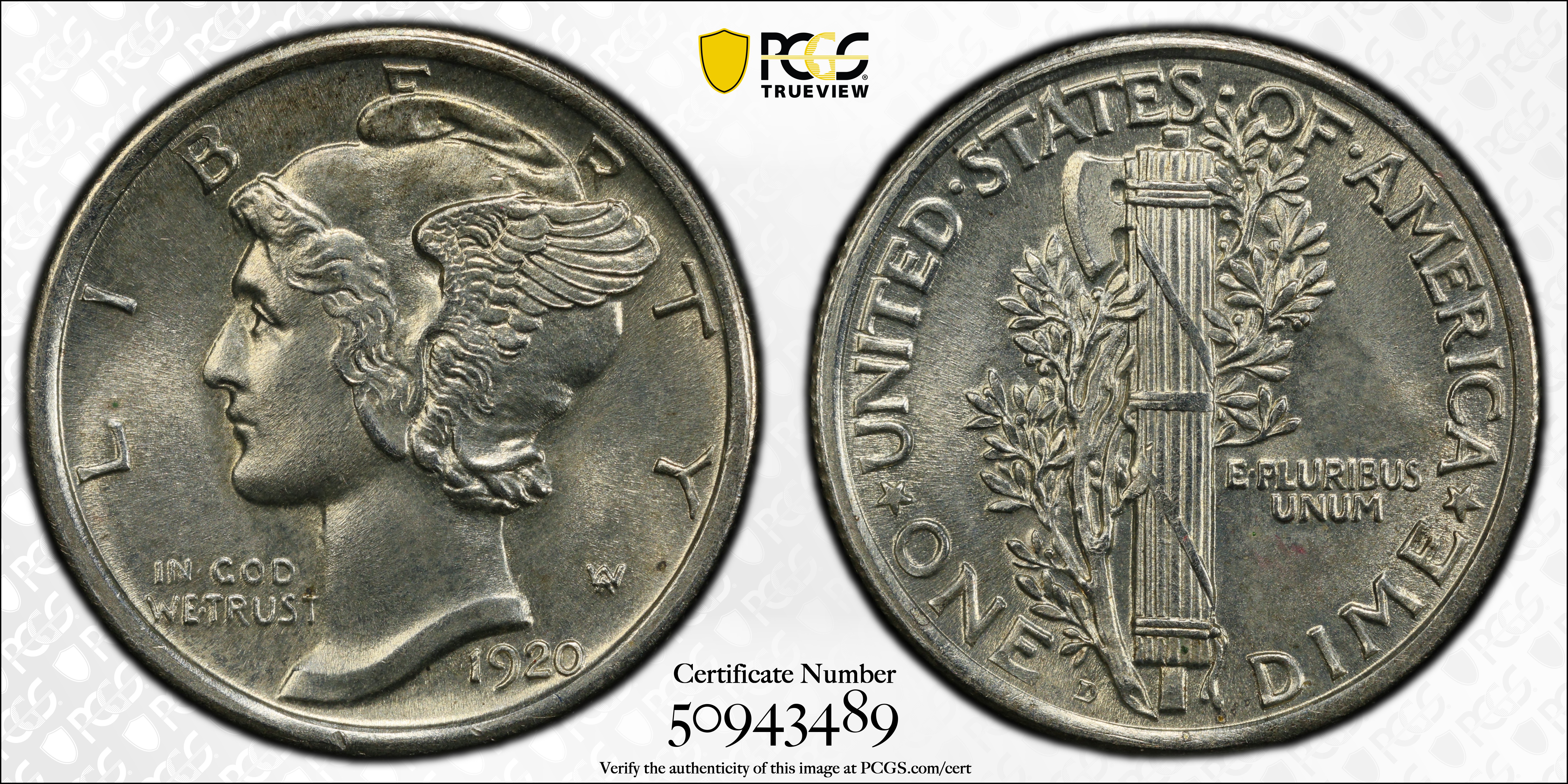 1920-D 10C MS64 Certification #50943489, PCGS #4930