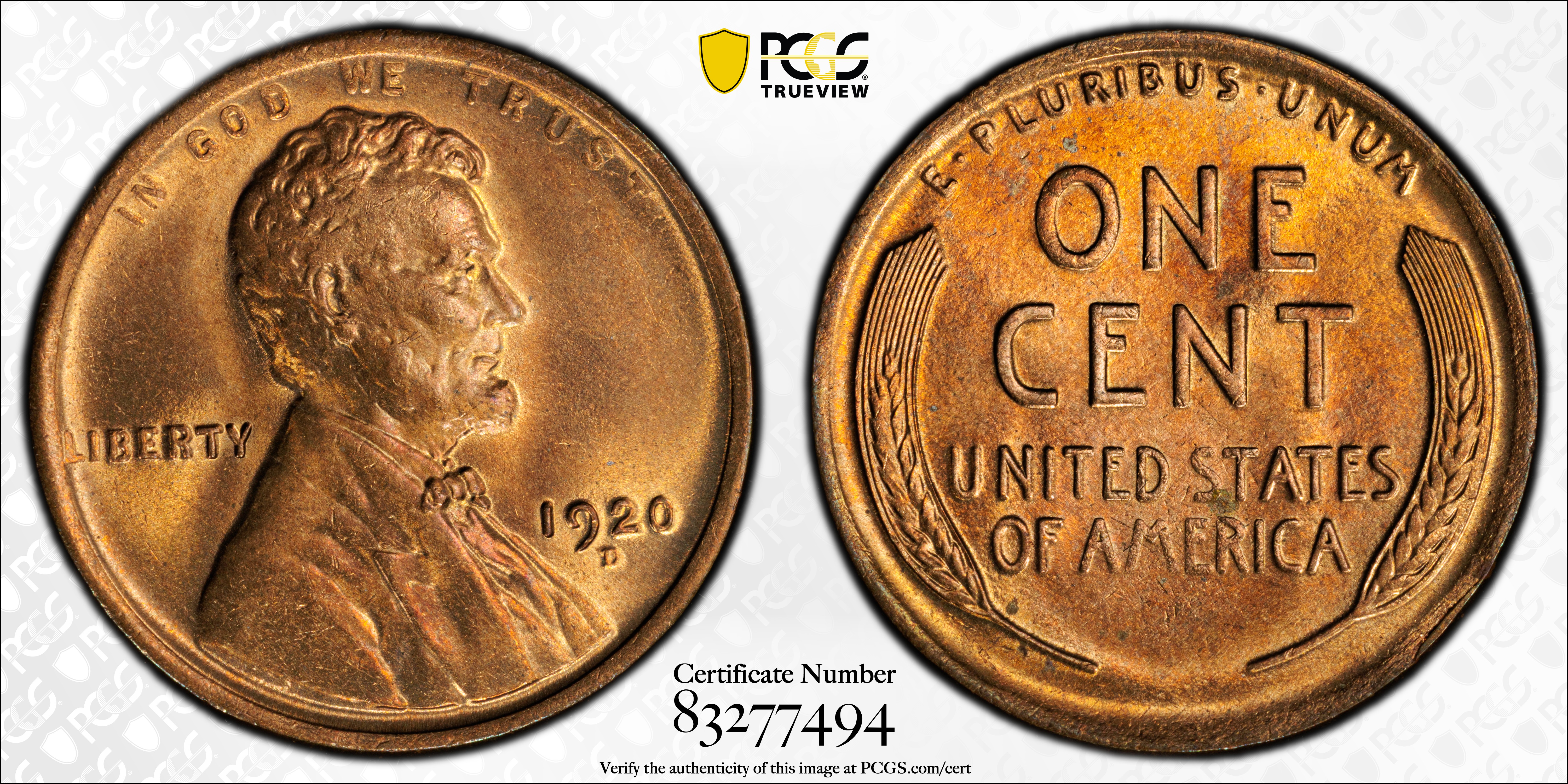 1920-D 1C, RD MS65RD Certification #83277494, PCGS #2527