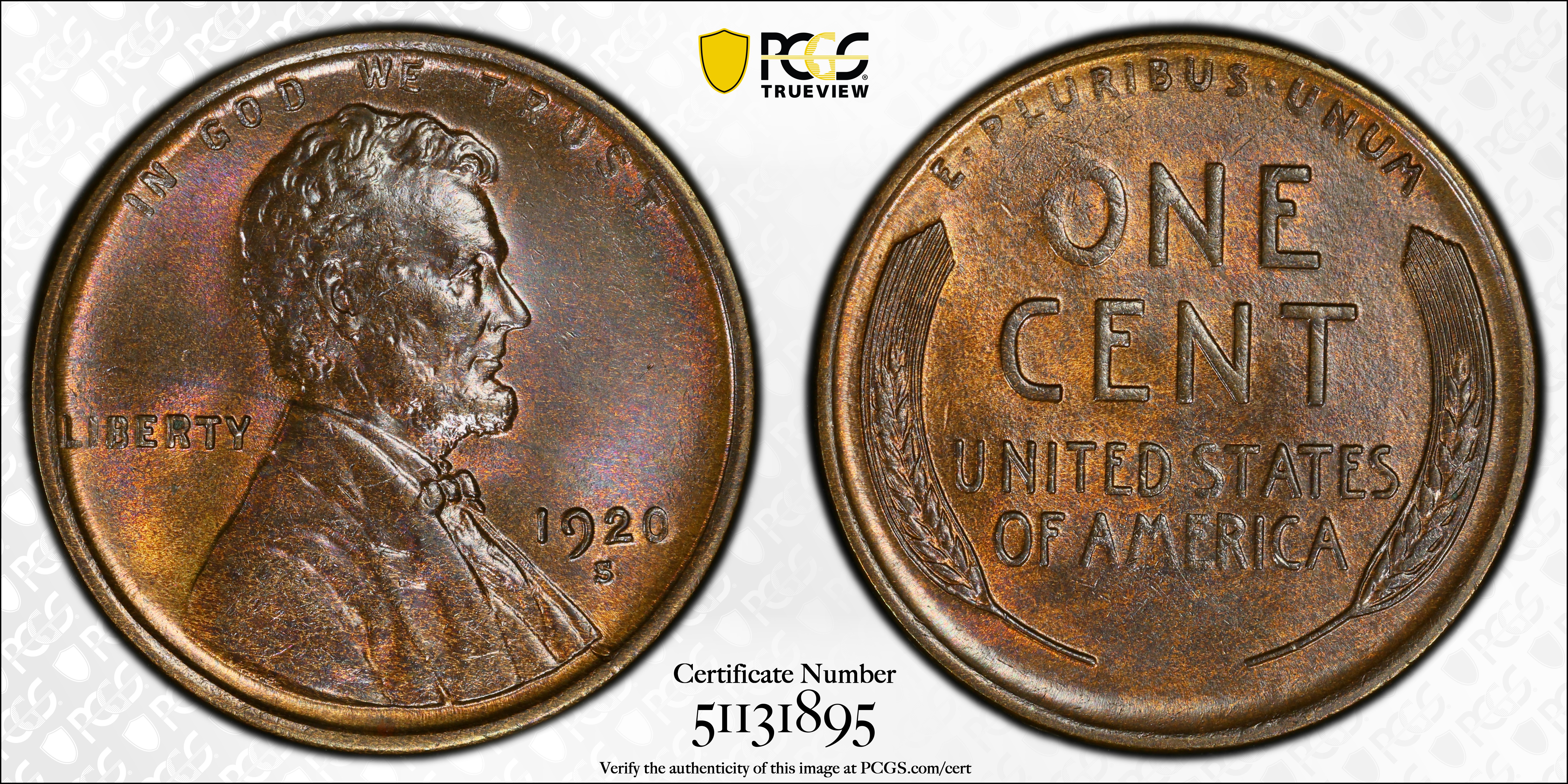 The 1920-S Lincoln Cent is considered a semi key date. It is difficult to find in Uncirculated condition. Especially in MS65 grade or higher. Most Uncirculated examples have Brown and Red brown surfaces. Uncirculated examples with full Red surfaces are very scarce in any condition.