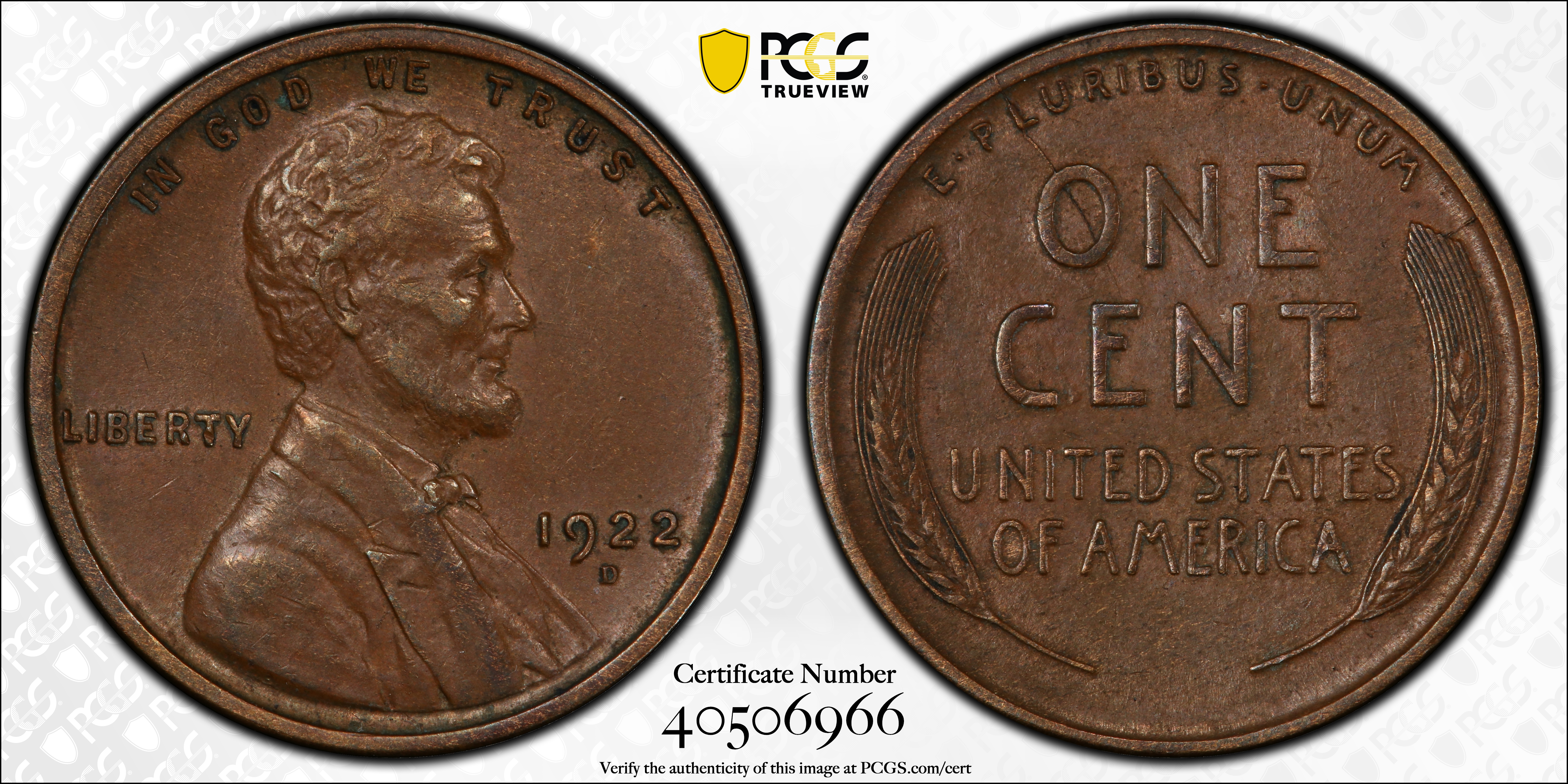 1922-D 1C, BN AU53BN Certification #40506966, PCGS #2537