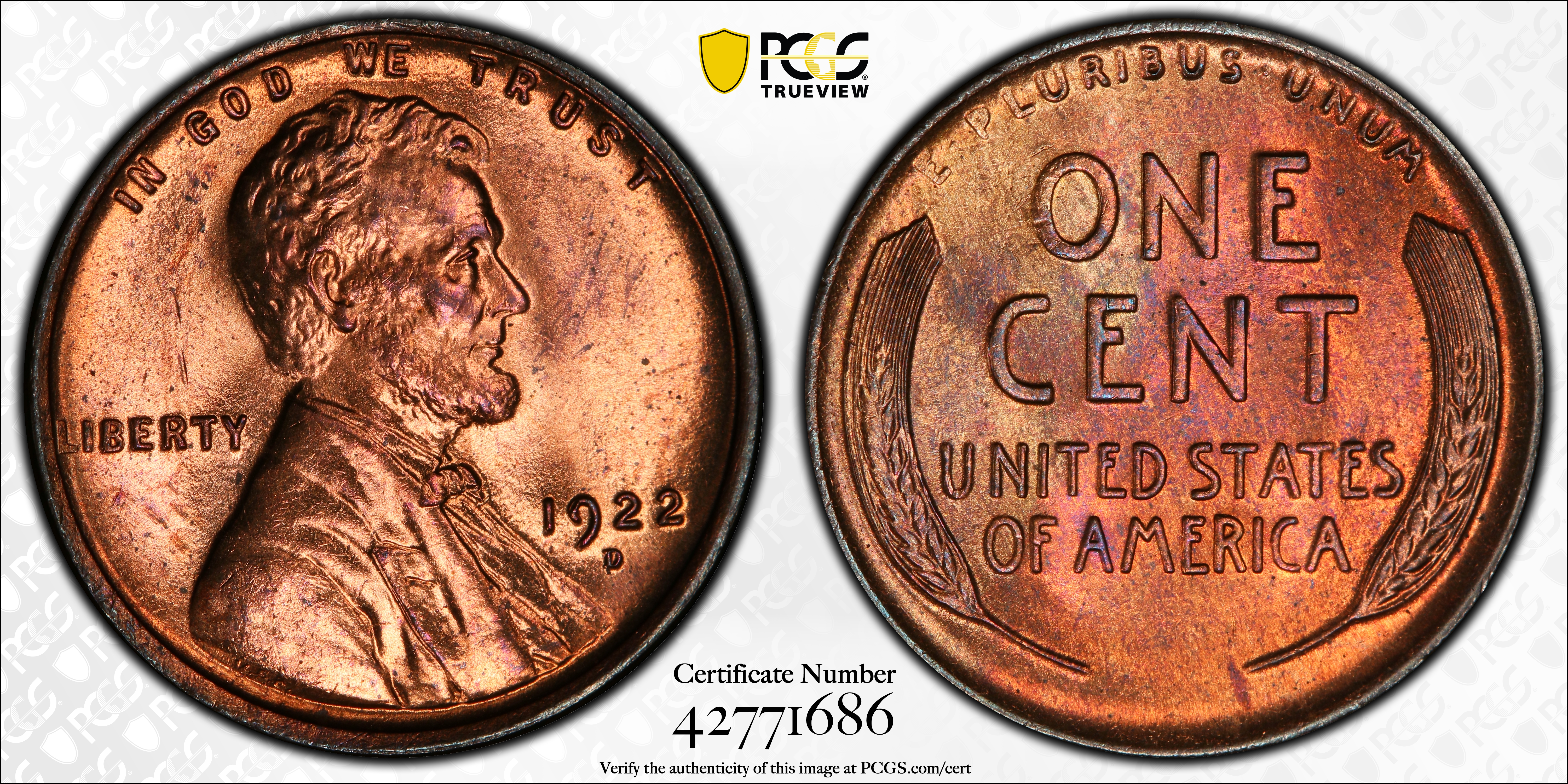 1922-D 1C, RD MS65+ RD Certification #42771686, PCGS #2539