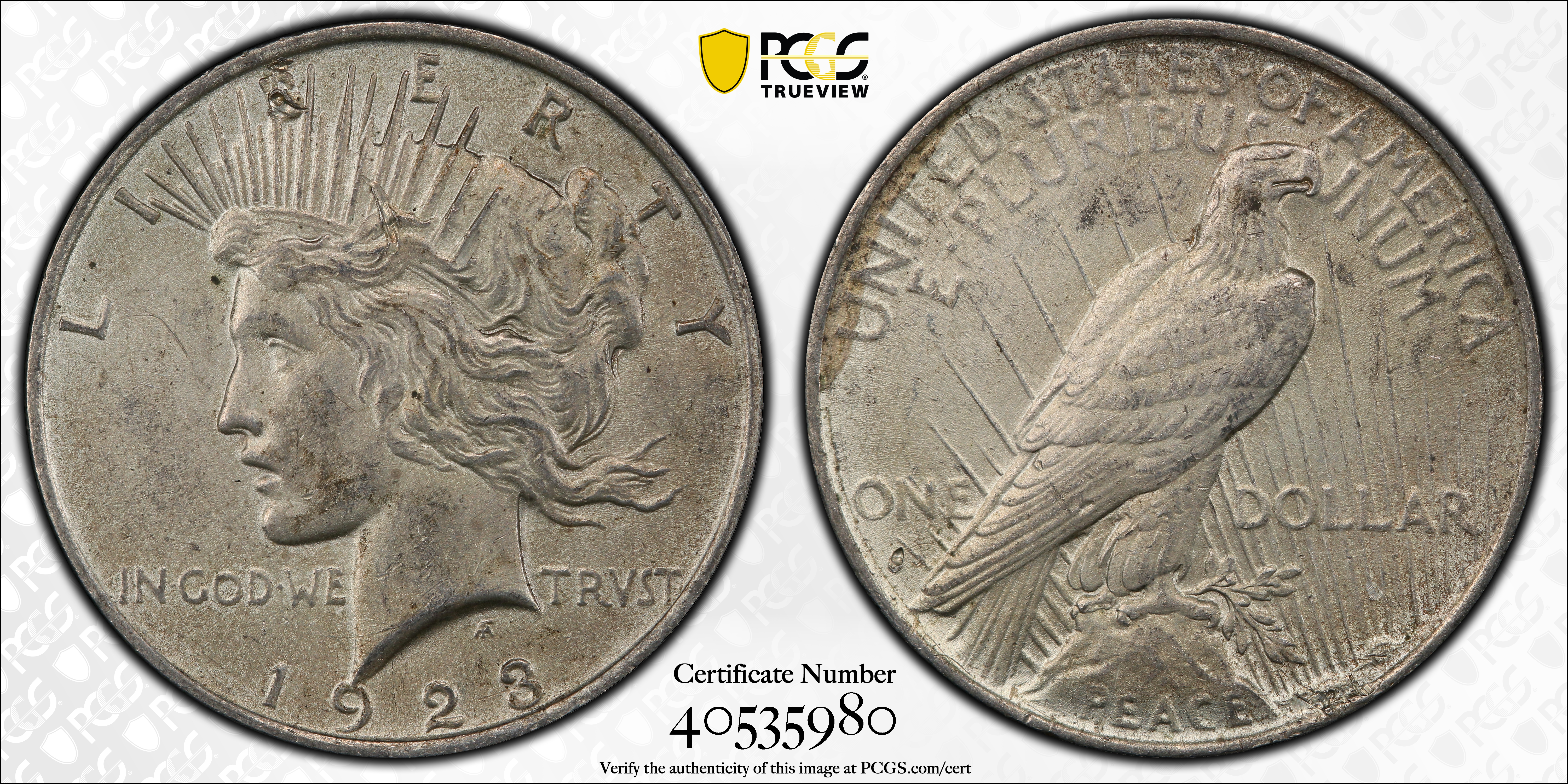 Many 1923 Peace dollars, like those dated 1922 and like certain other coins of the era, are often seen with milky-white spots that are virtually impossible to remove. These are believed to be the residue from dilute sulfuric acid at the Mint. Some coins have yellowish stains, particularly around the rims.