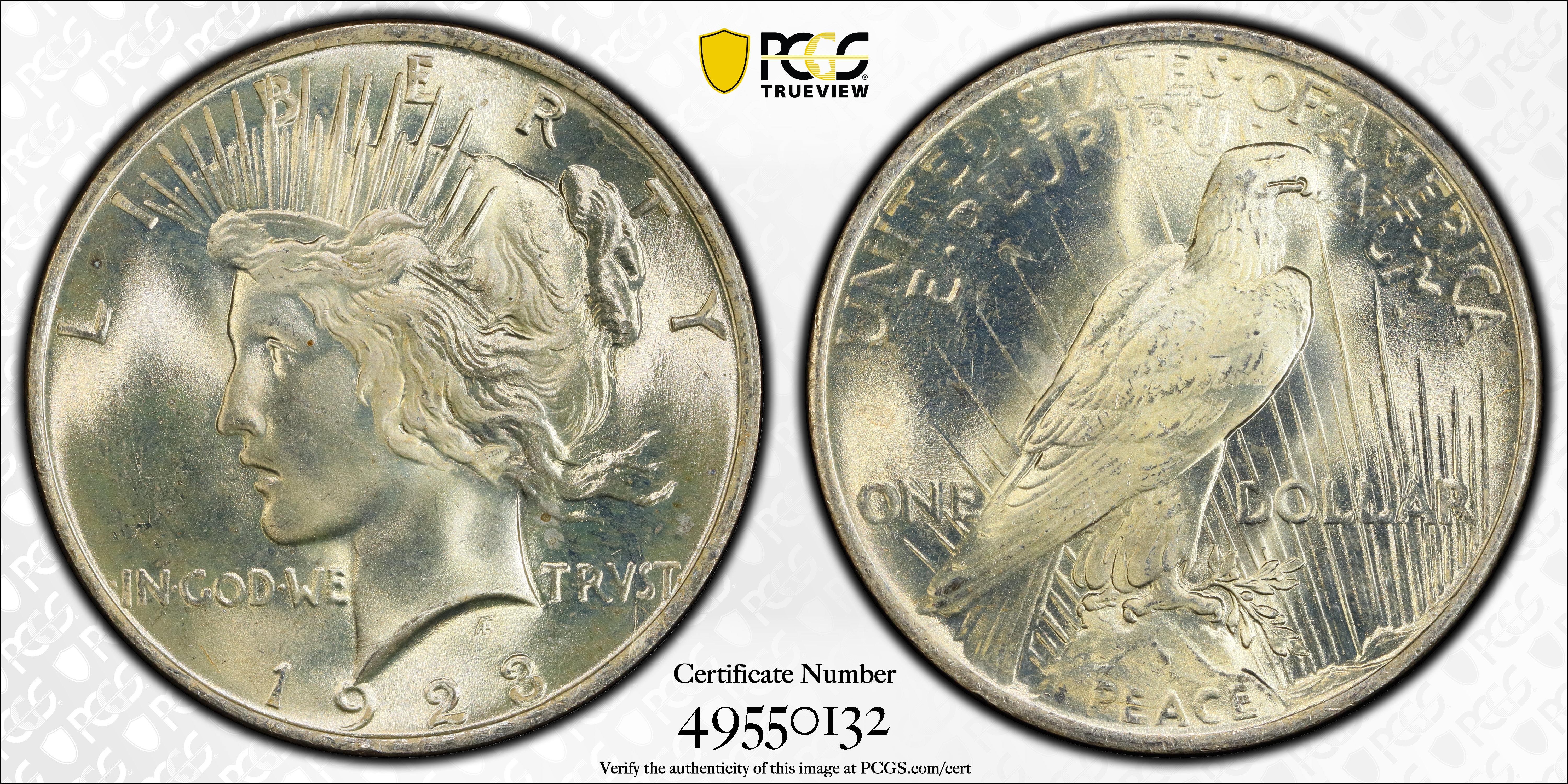 Mint State grades: The 1923 Peace dollar is very plentiful in Mint State, in all grades from MS-60 through MS-65 or even higher. In fact, it may well be the commonest of all Uncirculated Peace dollars.
