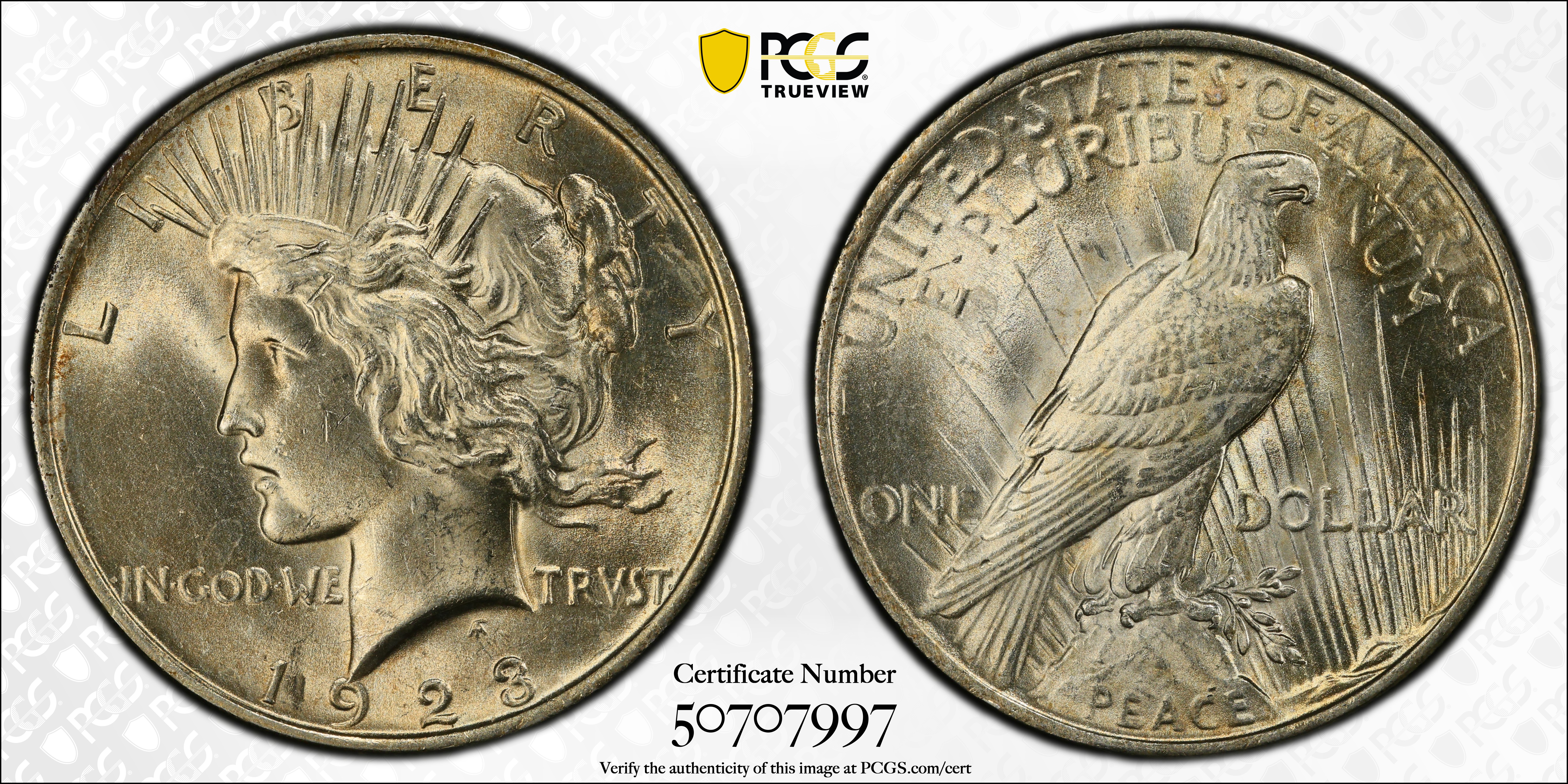 Mint State grades: The 1923 Peace dollar is very plentiful in Mint State, in all grades from MS-60 through MS-65 or even higher. In fact, it may well be the commonest of all Uncirculated Peace dollars.
