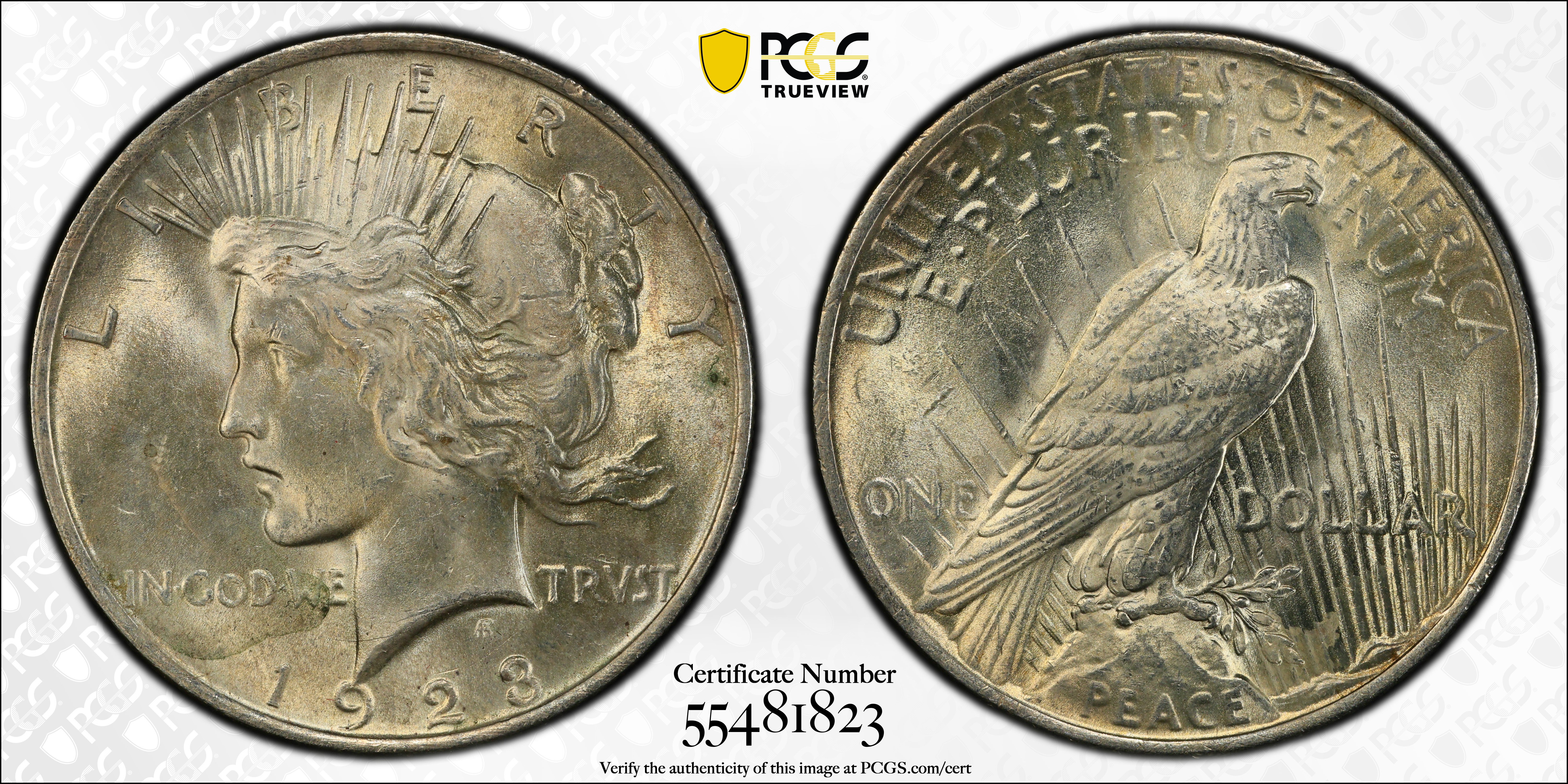 Mint State grades: The 1923 Peace dollar is very plentiful in Mint State, in all grades from MS-60 through MS-65 or even higher. In fact, it may well be the commonest of all Uncirculated Peace dollars.