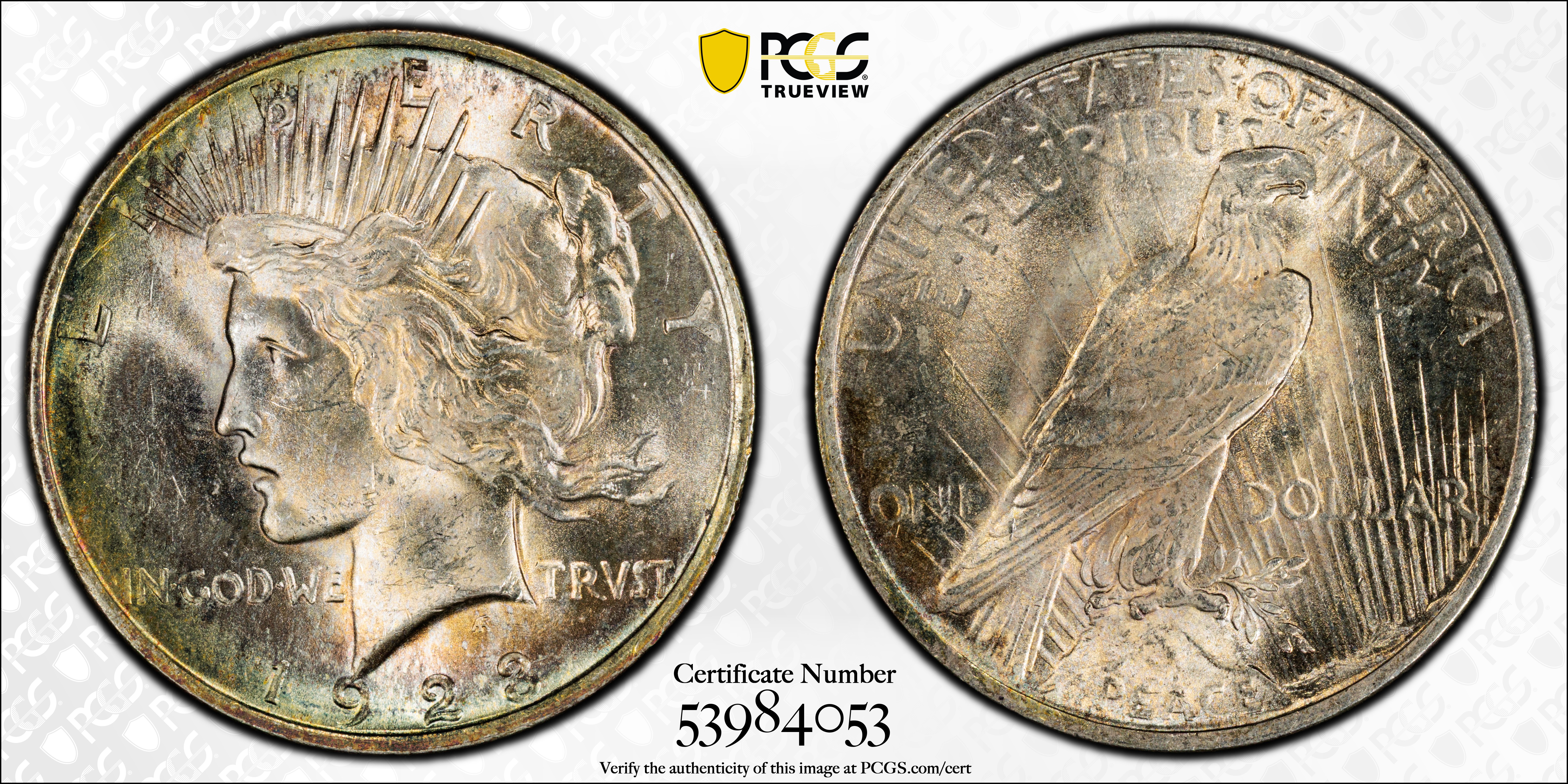 Many 1923 Peace dollars, like those dated 1922 and like certain other coins of the era, are often seen with milky-white spots that are virtually impossible to remove. These are believed to be the residue from dilute sulfuric acid at the Mint. Some coins have yellowish stains, particularly around the rims.